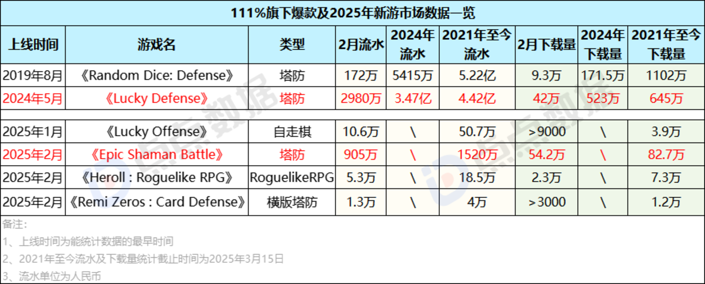 那么《Epic Shaman Battle》究竟是一款怎样的游戏?其市场表现如何?2025年上线的其他3款新游表现如何?玩法如何?111%自成立以来有怎样的产品历程?曾经的爆款目前数据如何?下文中,点点出海将结合下表一一分析上述问题。