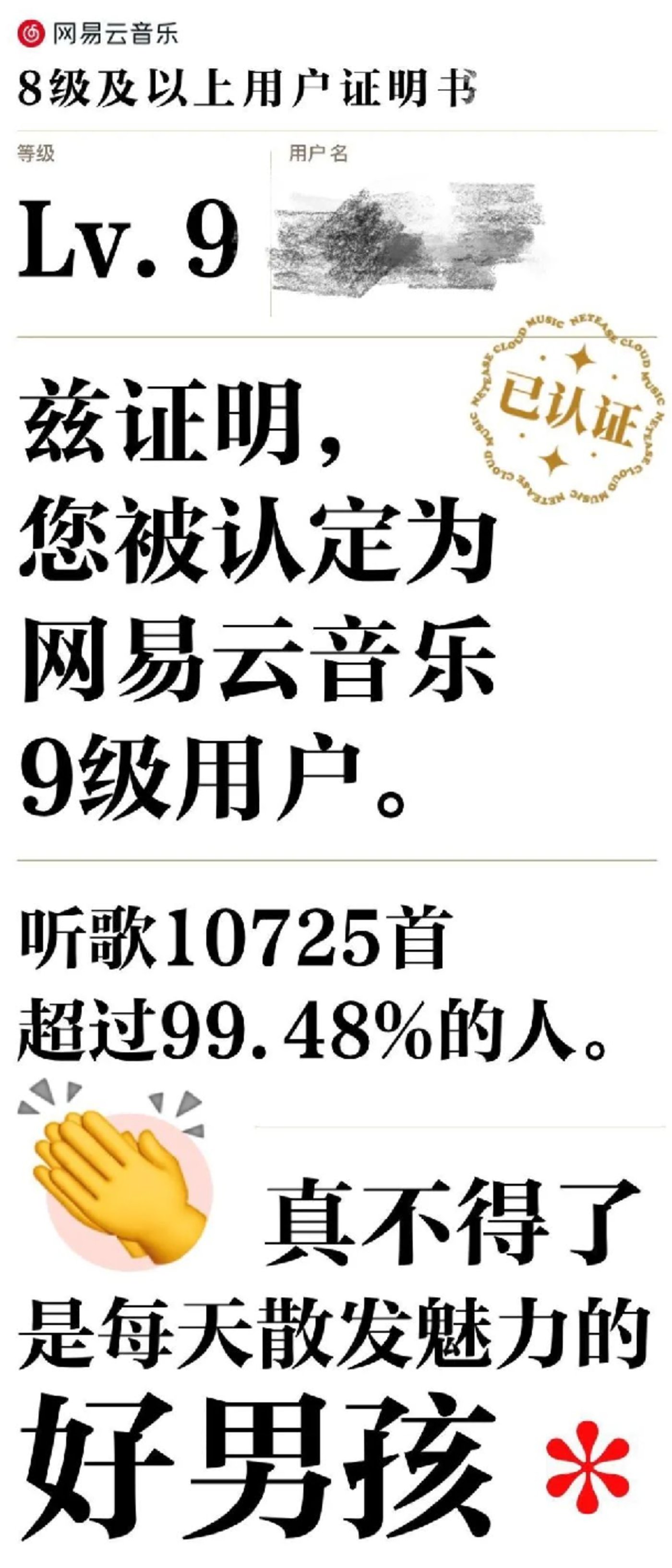 网易云音乐在2022年还给平台8级以上用户发过「好男孩」「好女孩」认证,算是平台一种“社交”身份认证,被网友调侃为:这个账号的时间都用来听音乐了,是个好男(女)孩!