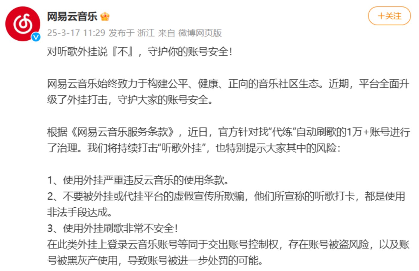 3月17日,网易云音乐通过官方微博发布治理公告,宣布对找“代练”自动刷歌的1万+账号进行了治理,后续将持续打击“听歌外挂”。
