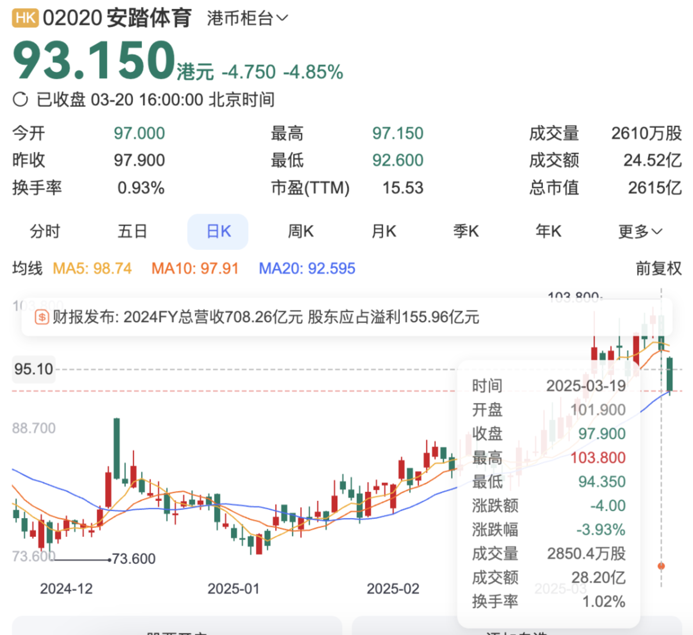 在发布财报后,安踏股价不升反降。3月19日上午盘中,安踏股价一度跌幅超7%,截至下午收盘安踏股价97.90港元/股,跌幅达到3.93%。在发布财报的第二天,安踏股价持续下滑,收盘价93.15港元/股,跌幅达4.95%。