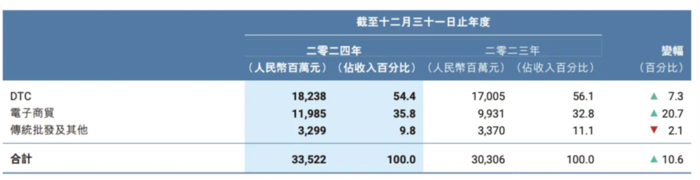 2024年,安踏DTC模式贡献182.38亿元,占总营收的54.4%,同比增长7.3%;电子商务模式贡献119.85亿元,占总营收的35.8%,同比增长20.7%;传统批发及其他模式贡献32.99亿元,占总营收的9.8%,同比下滑2.1%。无论从营收规模上看,又或者是从增速上看,安踏的零售新业态已经开始展现了明显的效果。