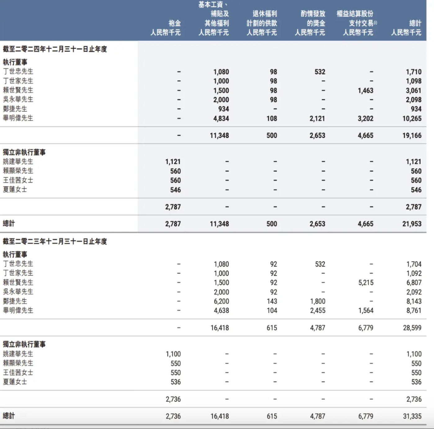 虽然在2024年安踏盈利大幅增加,但安踏高层的整体薪资水平却开始下滑。2024年,安踏执行董事薪资合计1916.6万元,较2023年减少32.98%。在安踏的董事会中,执行董事、首席财务官毕明伟工资超过千万,超过其他所有人总和,在董事会减薪潮中薪资逆势增长17.17%。