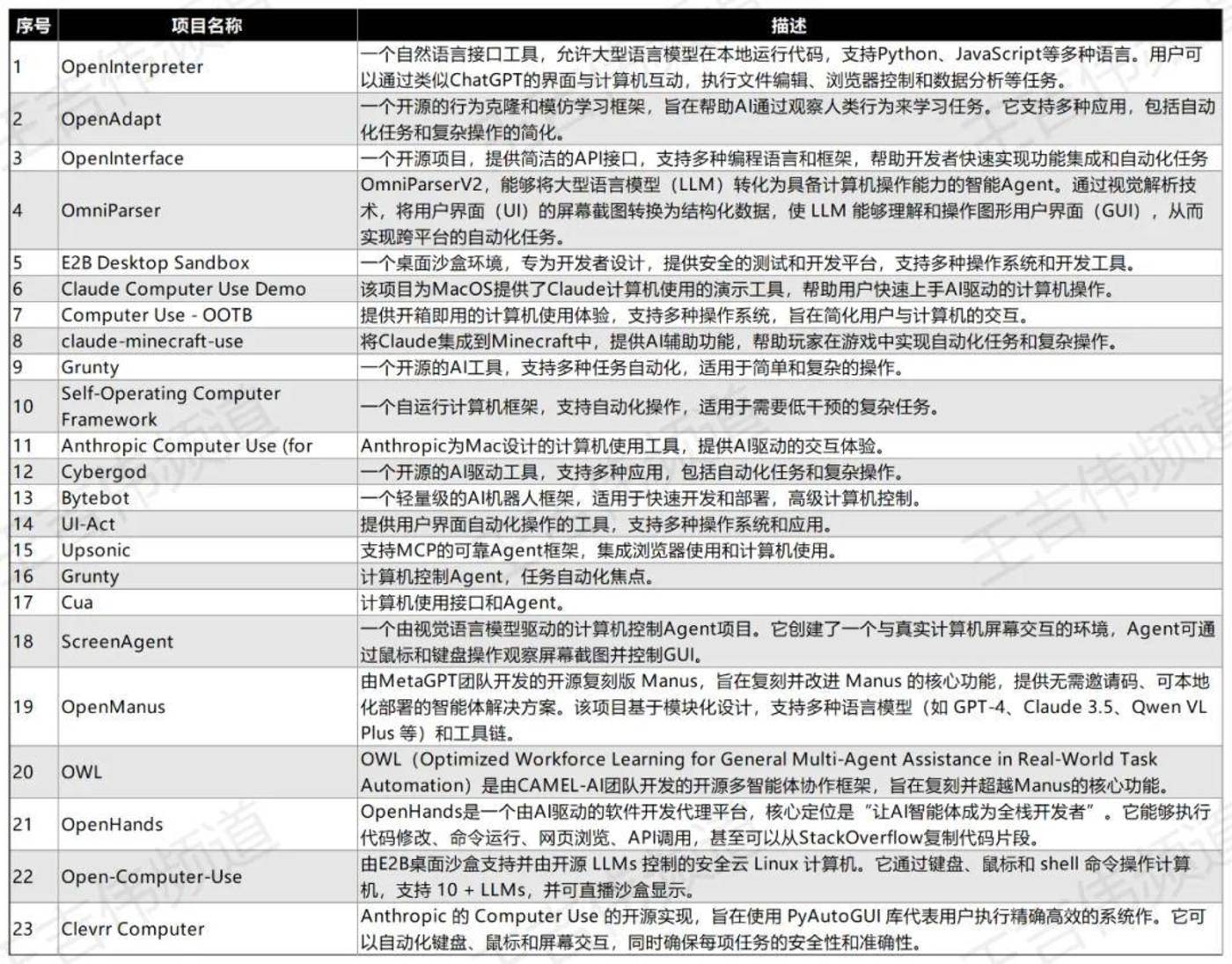 需要说明的是,Computer Use Agent和GUI Agent经常被混淆。两种智能体各有其独特的优势和适用场景:Computer Use Agent 更适合处理复杂的多任务和跨平台操作,GUI Agent则在图形用户界面交互和精准操作方面表现出色。还有一些项目,则是两种技术融合型的智能体。关于GUI Agent,我会在后面的文章中跟大家介绍。
