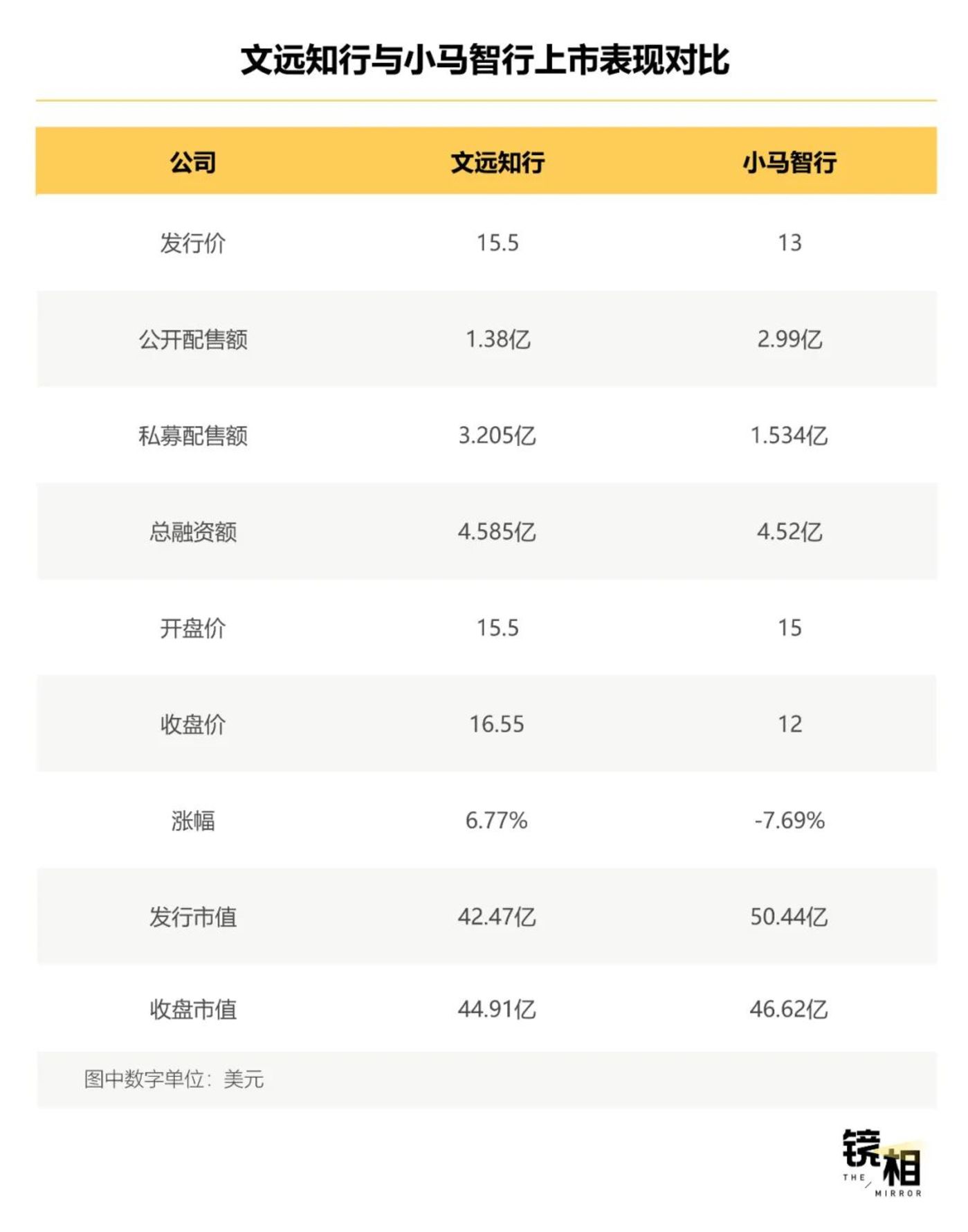 IPO前,小马智行累计融资7轮超13亿美元,估值100亿美元,文远知行累计融资10轮超12亿美元,估值51亿美元。小马智行估值更高,不过两家公司融到的钱差距不大。