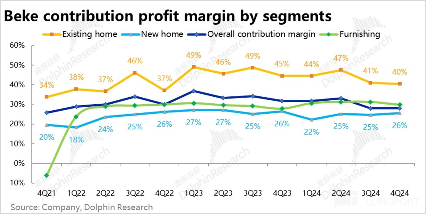 整体来看,贝壳本季整体的贡献利润率为 28%,环比上季还下降了 0.1pct。此次在营收体量大增的情况下,利润率却没有展示出多少向上弹性(尤其是一航道的房屋中介业务),海豚投研认为一定程度上是体现出该业务重人力、重履约的特性。业务的利润率未必会虽体量增大而自然提高,更依赖与对员工分佣比例的调整(否则,逻辑上无论营收规模是增长几倍,需要分配给员工的分佣比重并不会自然下降)。