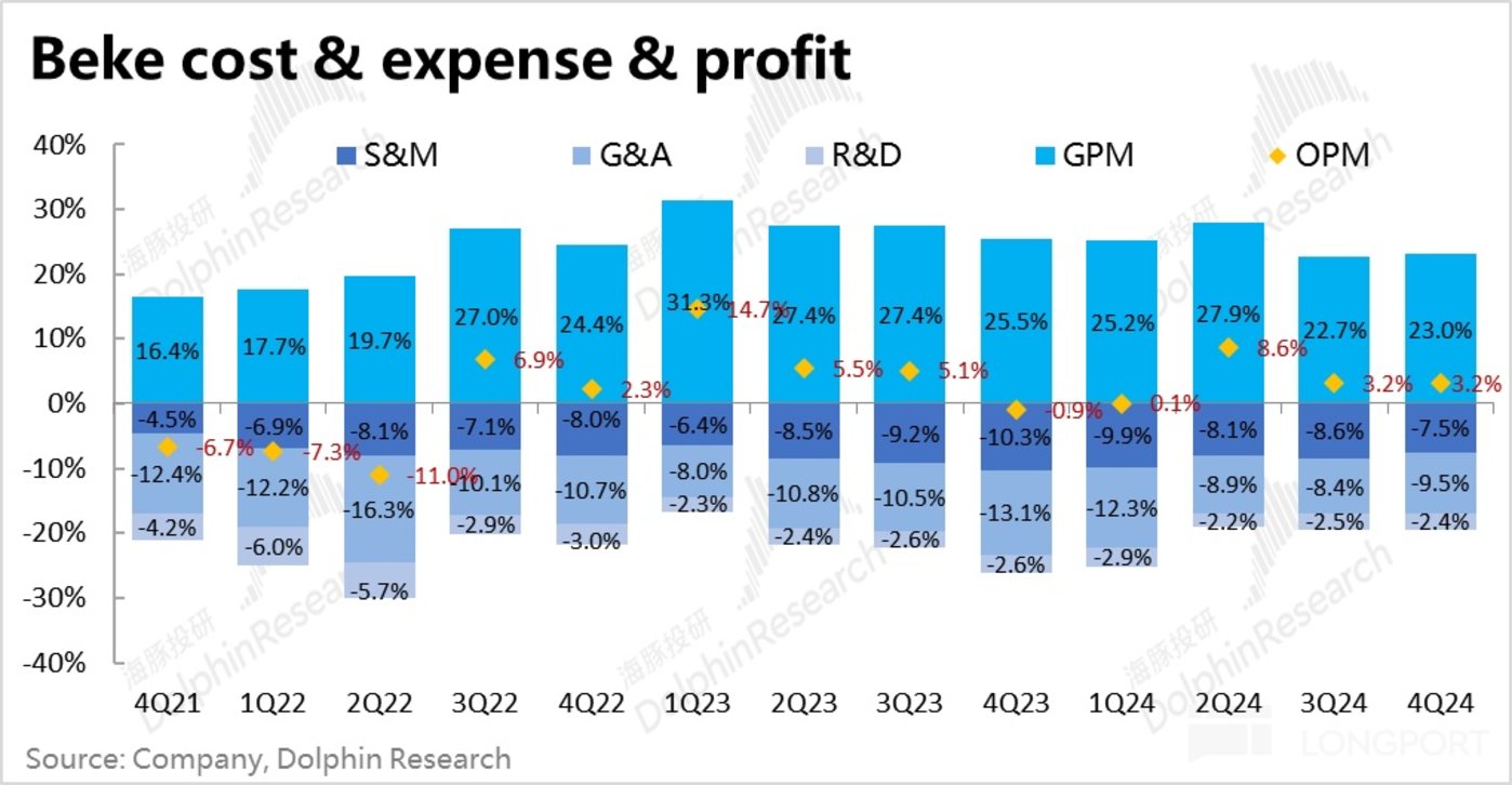 但是,正如我们在火线解读中提到的。在巨大的行业复苏红利之下,贝壳虽享受到了业务体量的快速扩张,但却并未能带来增量的利润是本次财报最大的问题。在不对员工 “苛责”,管理员工分佣比例的情况下。住房中介天然重人力和履约的特性,使得毛利率并没有呈现天然随规模扩张,自然提升的特性。