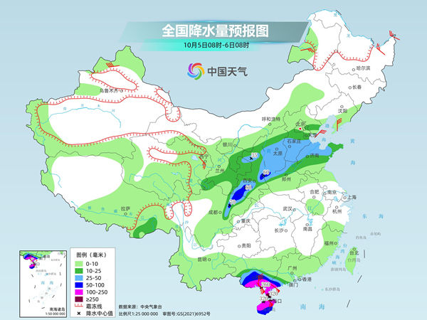 具体来看,中央气象台预计,今天,西北地区东部、华北中西部和南部、黄淮东部、四川盆地北部、华南南部和海南岛等地部分地区有大到暴雨,其中,广西南部、广东西南部、海南岛大部等地部分地区有大暴雨,广西东南部沿海、广东西南部沿海、海南岛北部等地局地特大暴雨(250~320毫米)。