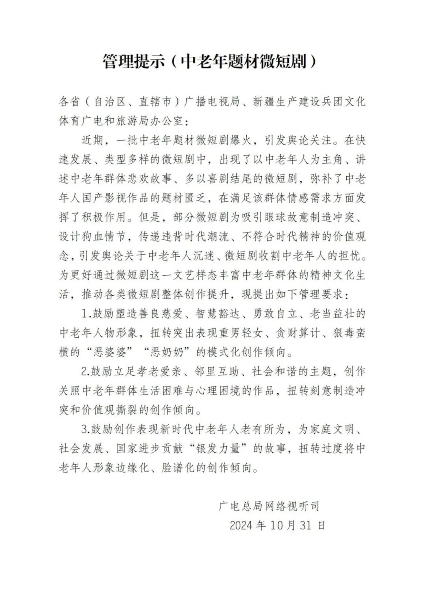 进入11月,市场对短剧的监管力度进一步收紧,广电总局发布的两个管理提示,分别指向中老年短剧和霸总短剧。对此,某业内头部短剧公司负责人告诉镜象娱乐,公司明年的内容布局中,已经没有霸总题材。