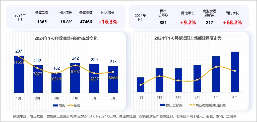 根据勾正科技发布的《短剧营销正当时:2024年H1微短剧行业观察与营销指南》中的数据,今年上半年,品牌合作的商业微短剧数量同比增长68%,几乎比去年翻了一倍。在这之中,2024 年上半年新入局的品牌占比47%,涉及汽车、航空航天、医药、新消费品牌等多个行业品类。