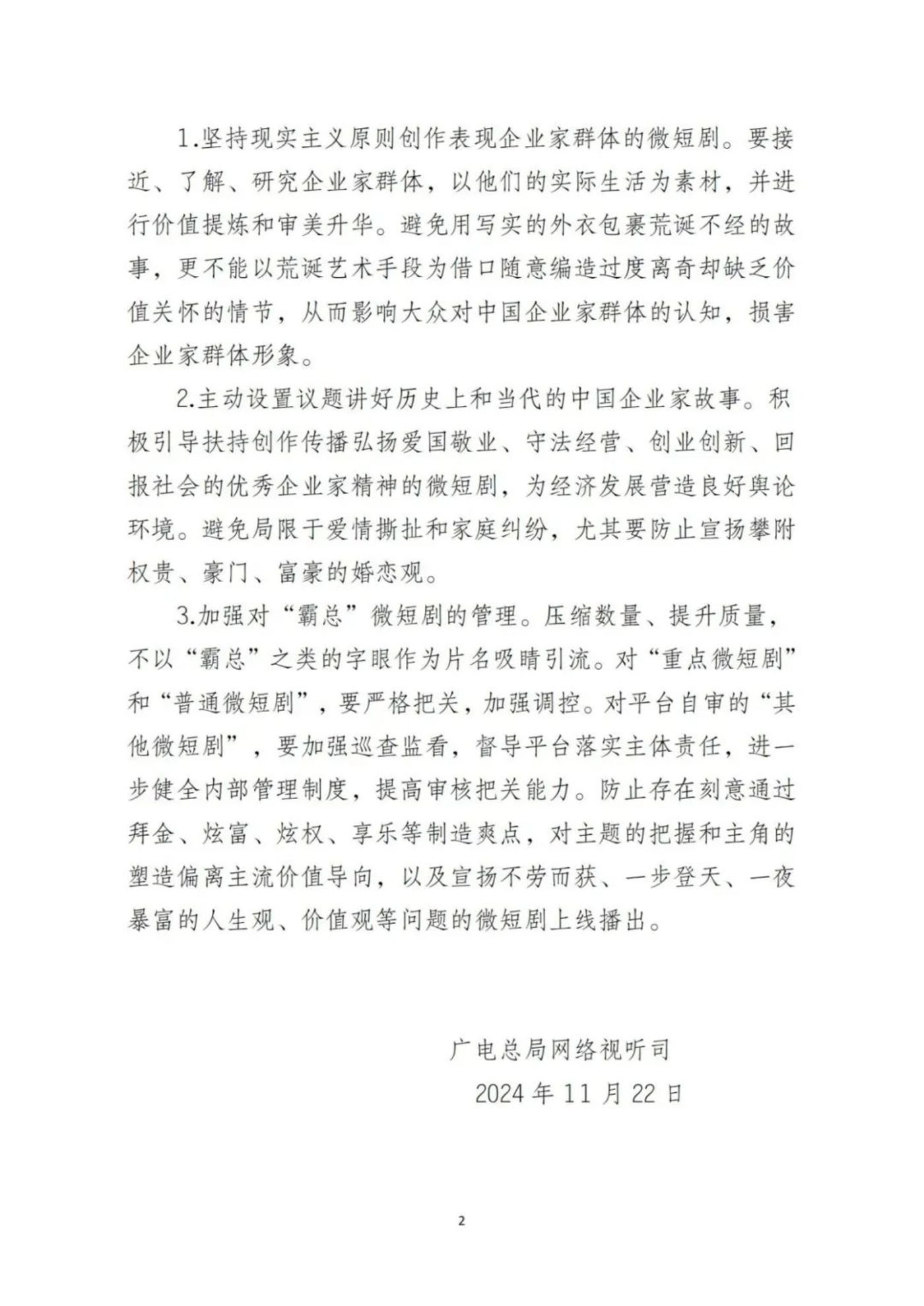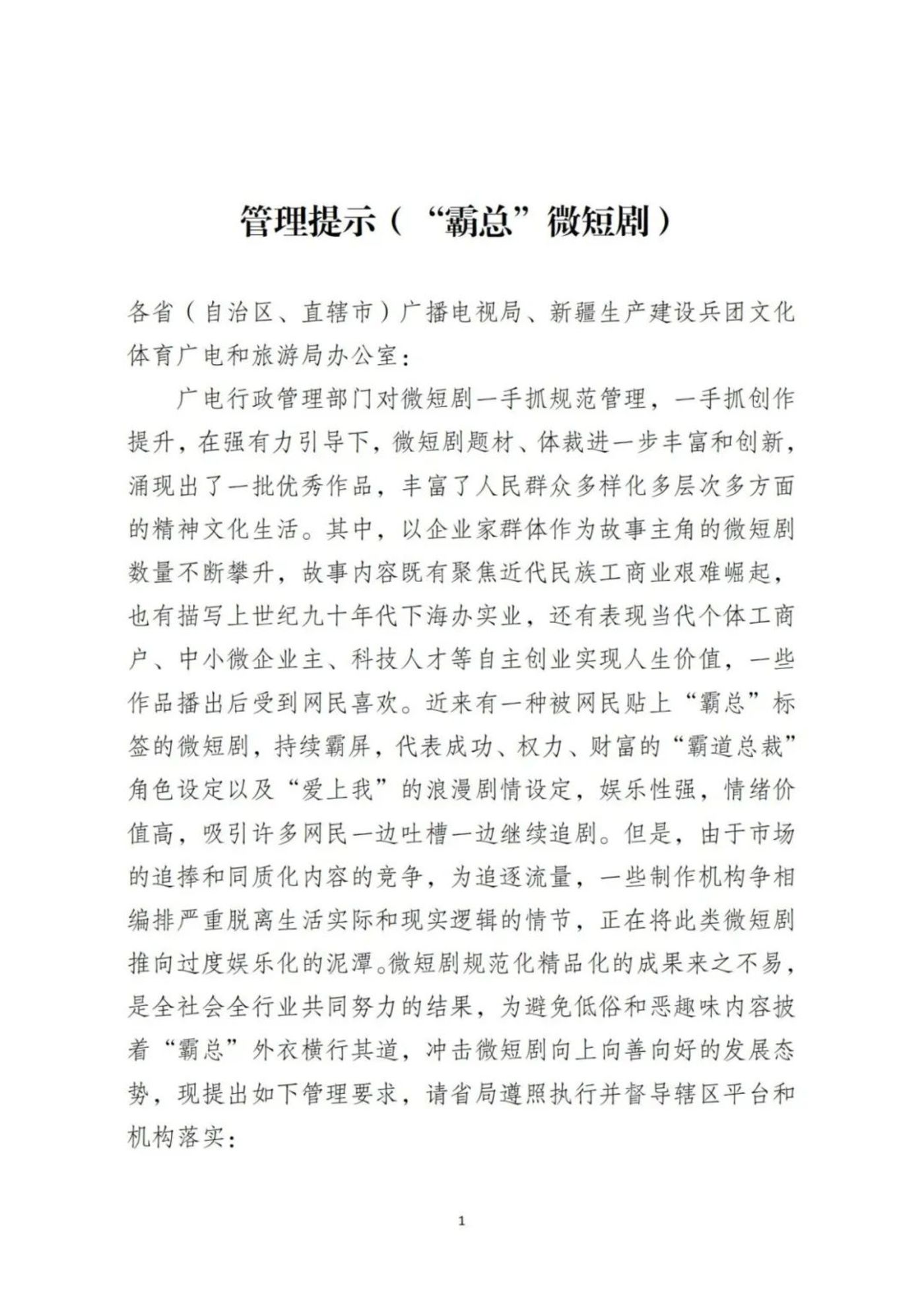 并且需要注意的是,这两份文件虽有直接点名,但涉及的内容范围其实更大。比如,《管理提示(“霸总”微短剧)》中指出:“不以’霸总’之类的字眼作为片名吸睛引流……防止存在刻意通过拜金、炫富、炫权、享乐等制造爽点,对主题的把握和主角的塑造偏离主流价值导向,以及宣扬不劳而获、一步登天、一夜暴富的人生观、价值观等问题的微短剧上线播出。”这反映出,短剧新规指向的是更多类型的内容,随着各类文件进一步细化,短剧市场有望逐步建立起规范化发展的新秩序。