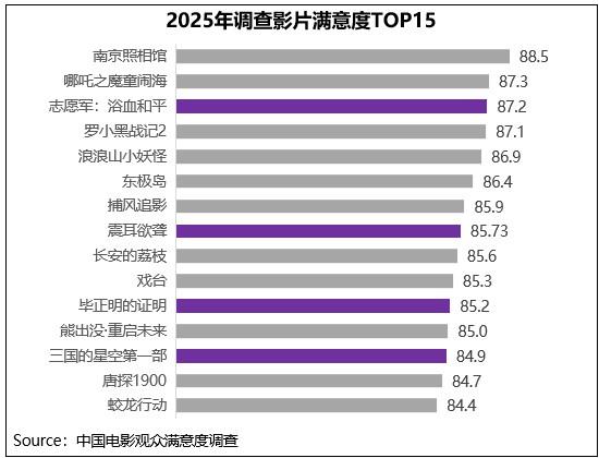 中国电影观众满意度调查・2025年国庆档调查结果显示,国庆档满意度得分85.4分,同比增长2.1分,为近四年最高。档期影片类型丰富、题材多样,满足假期观众多元化的观影需求。调查的7部影片中有3部超85分,战争题材的《志愿军:浴血和平》以87.2分居首,两部剧情片《震耳欲聋》《毕正明的证明》分居第二、第三位。