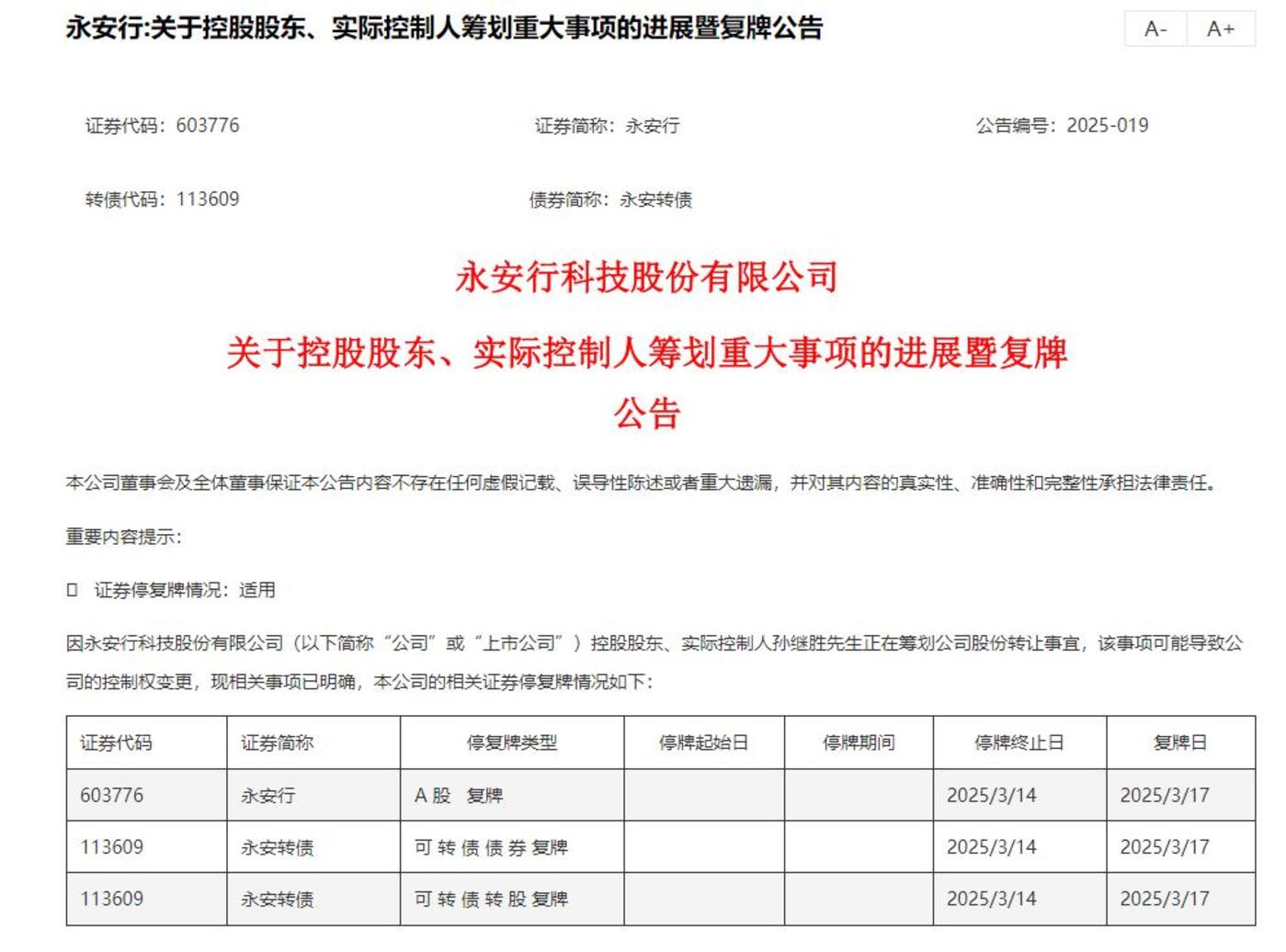 3月16日,停牌一周的A股上市公司永安行,发布了一则控股股东、实际控制人筹划重大事项的进展公告。