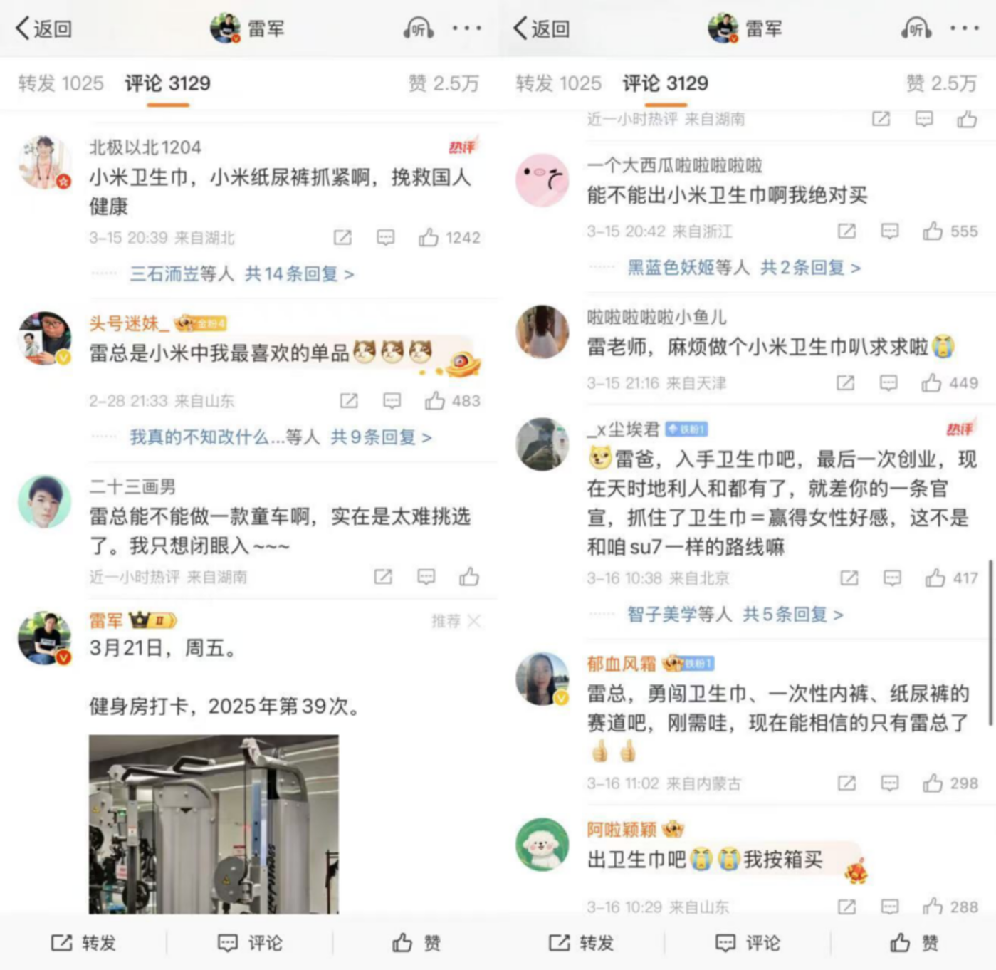 在小米明确不做卫生巾后,企业家们正排队替雷军“实现愿望”。