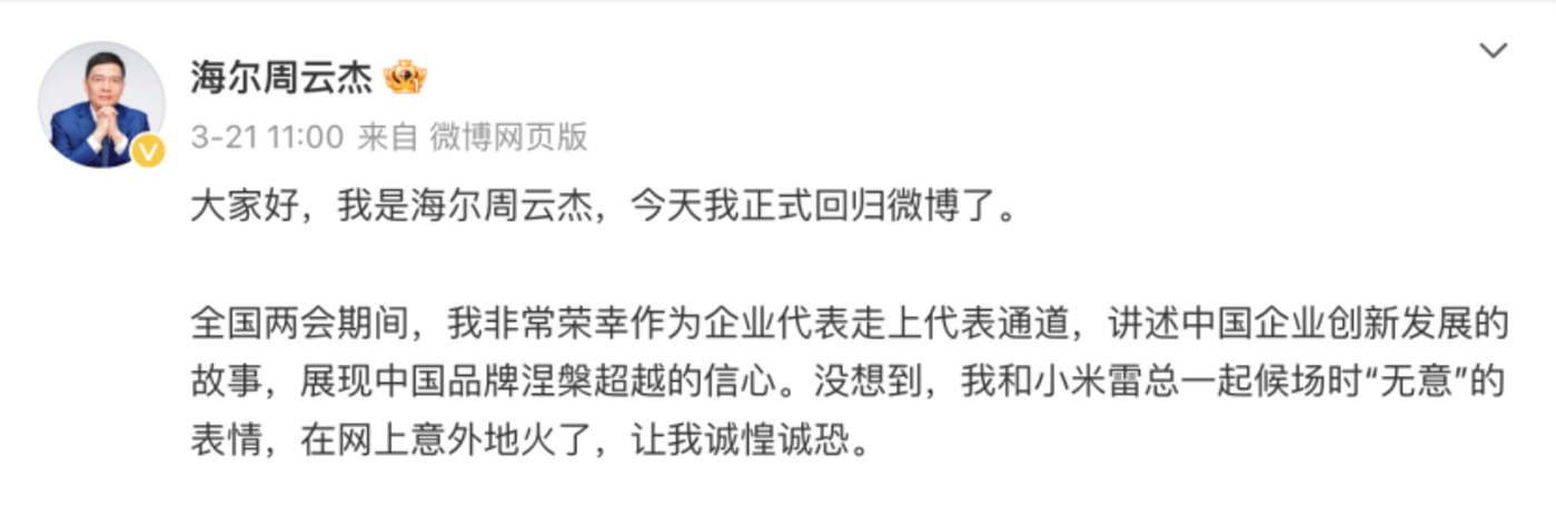更戏剧性的“带货场景”发生在两会现场。两会期间,雷军热情和粉丝打招呼,而站在雷军身后的周云杰露出了一些列略显无奈且被迫营业的表情,被网友做成了各种表情包后走红网络。