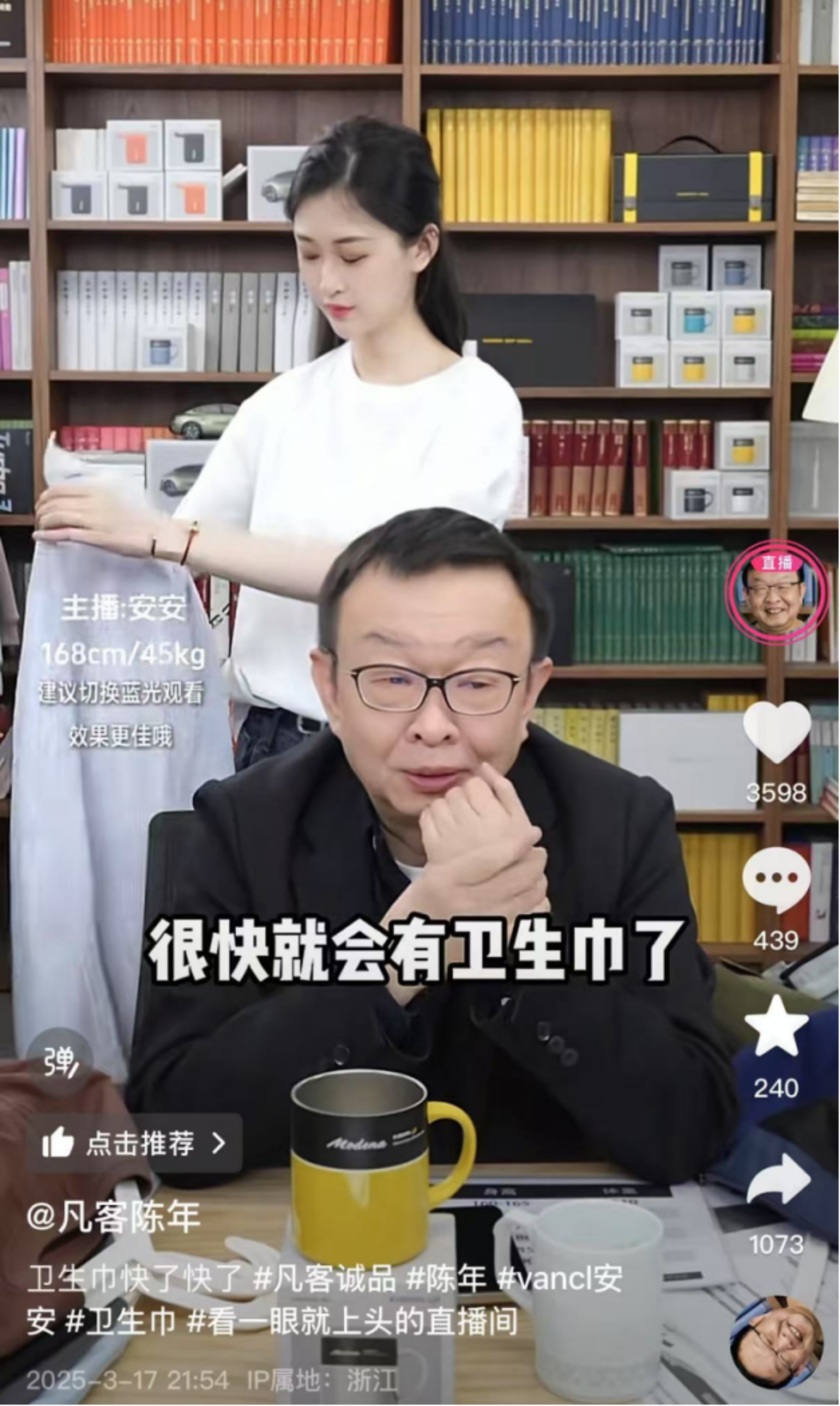 3月17日,陈年在社交平台透露,凡客有可能就要做卫生巾了,“很快就会上”;而东方甄选的自营卫生巾产品最快将在今年暑假推出。