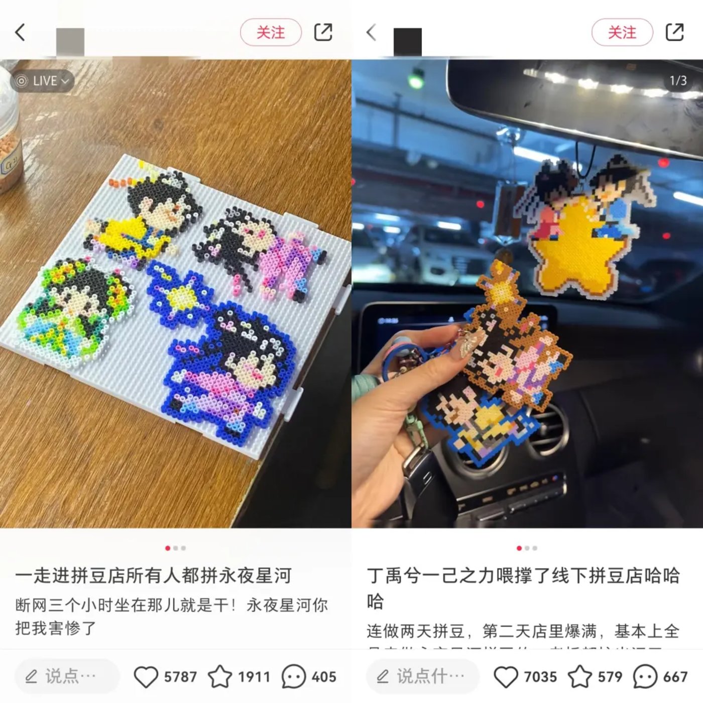 社交平台上,有人晒出了自己的成品,喊着“是谁还没有丁禹兮同款”,有人调侃“一走进拼豆店所有人都在拼永夜星河”,还有人哭诉拼豆已经“全网断货”,愿意出高价收购。