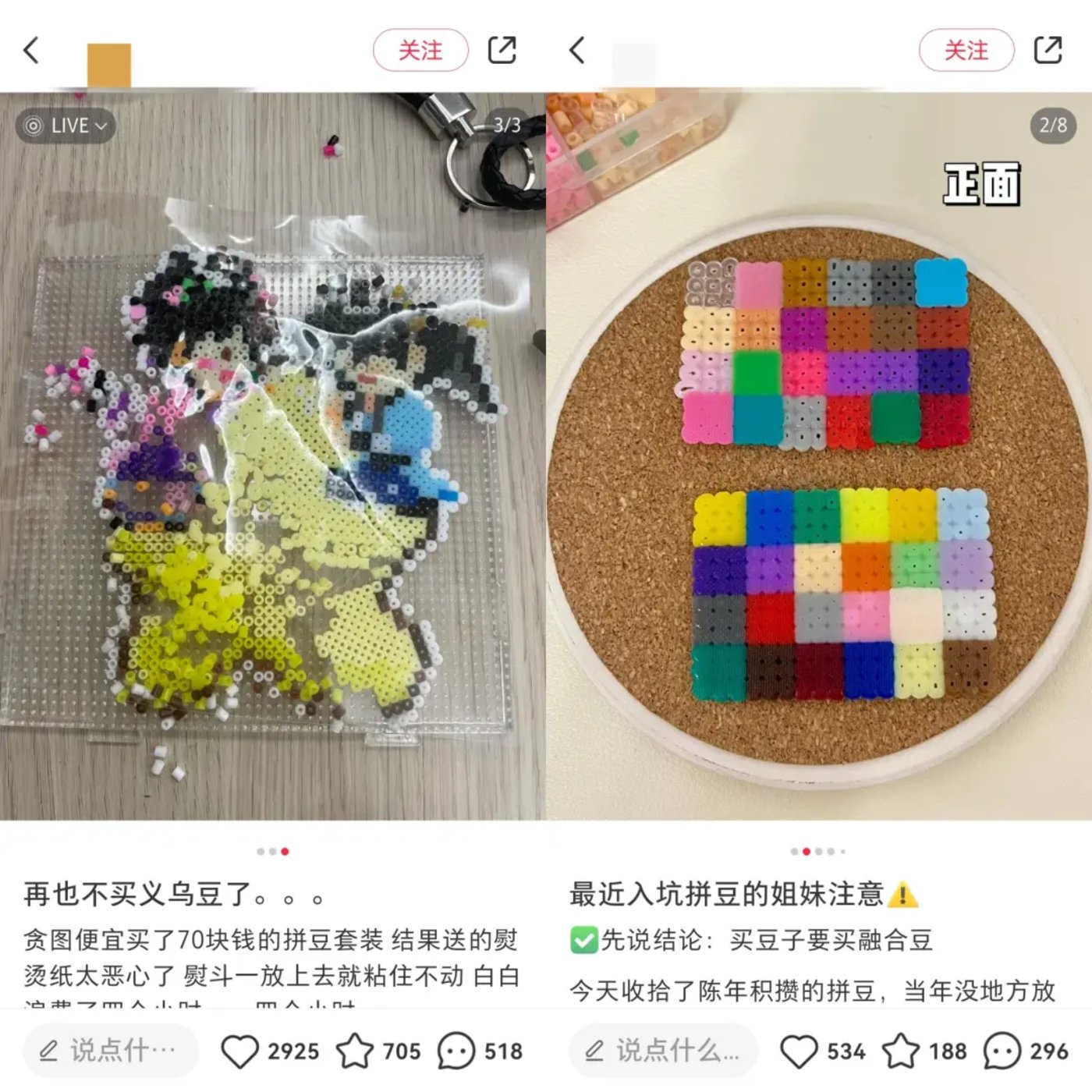 居居表示,一般大家会把拼豆分成融合豆和义乌豆两种,融合豆指的是所有拼豆高低和融点一致,在熨烫过程中能完美地融合在一起,实现“无孔”效果,而义乌豆则容易出现融点低、融点不一致和有高低差异的问题,“义乌豆会导致辛苦拼出来的作品,最后效果却很丑,还可能直接糊成一团”。