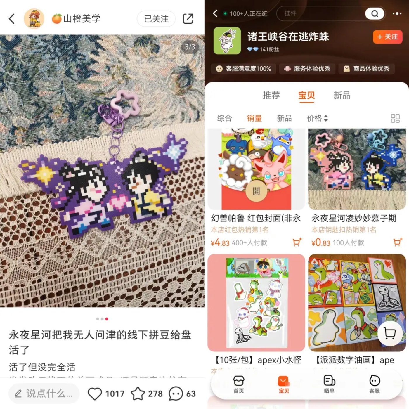 腾讯官方的“腾讯视频草场地”天猫旗舰店中,《永夜星河》同款拼豆挂件还能有着“正版”的名号,售价可以达到39.9元,但在其他淘宝、闲鱼卖家中,《永夜星河》同款拼豆挂件已经降价到了8.8元、9.9元还包邮。