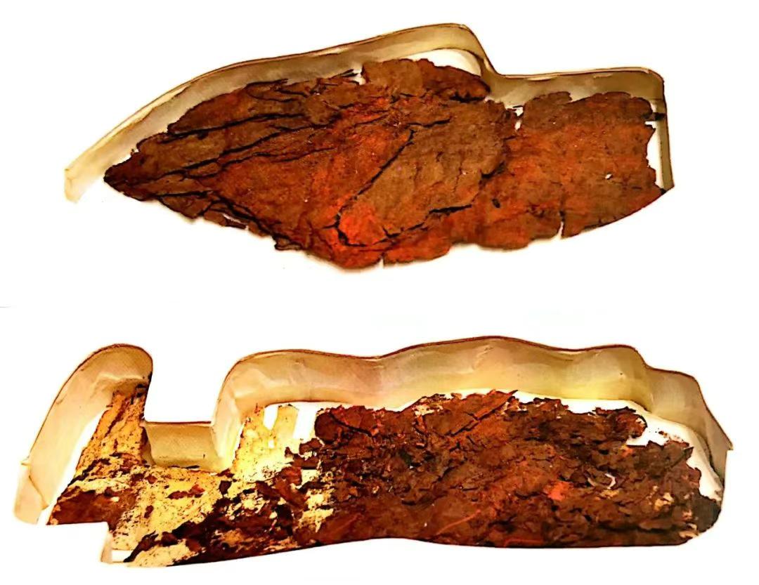 △未完全剥离的帛书残片。目前,湖南省博物馆已完成全部帛书的标准化影像采集,并通过760纳米的近红外成像,在其中一片未完全剥离的帛书上发现肉眼不可见的墨迹字样40余个。