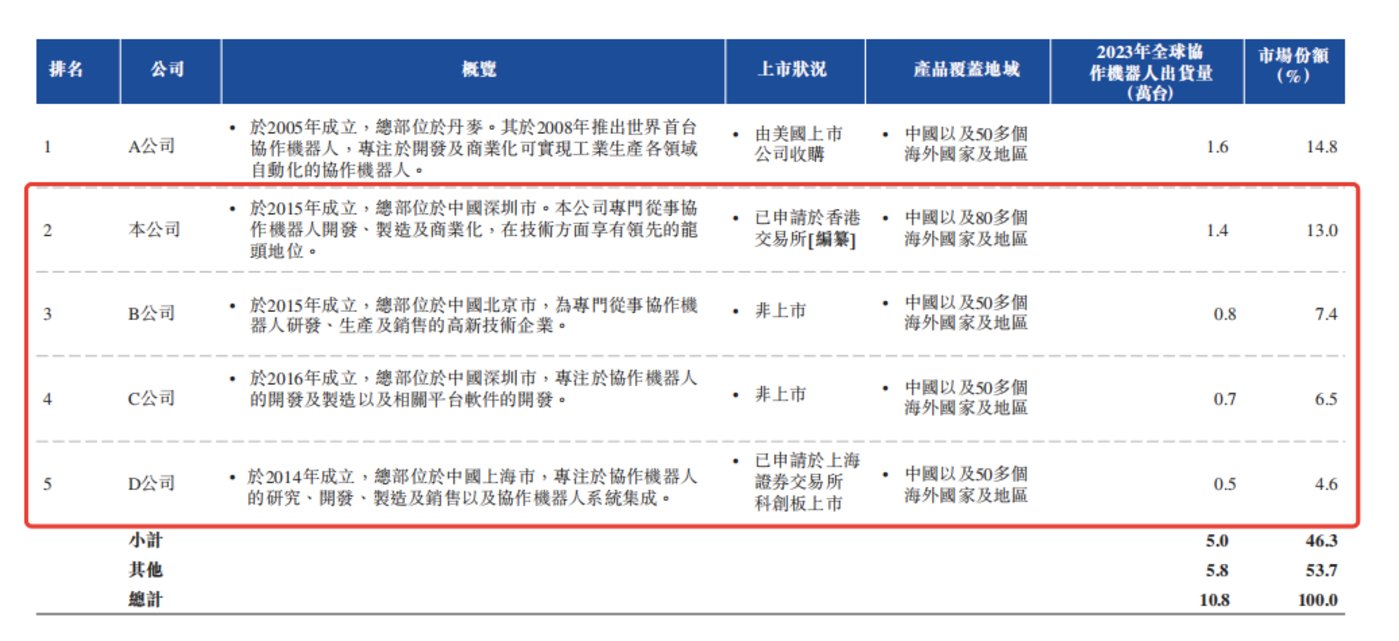 据灼识咨询报告,按出货量计算,2023年全球协作机器人行业的前五大市场参与者中,有四名为中国制造商。
