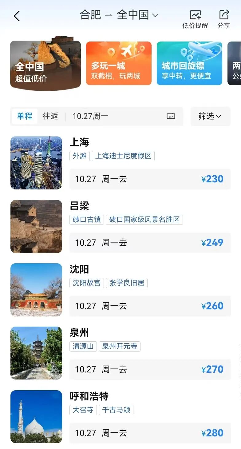 看到价格大跳水之后的机票,错峰出行确实是不错的选择,机票价格比高铁还低,景区人流也不拥挤。