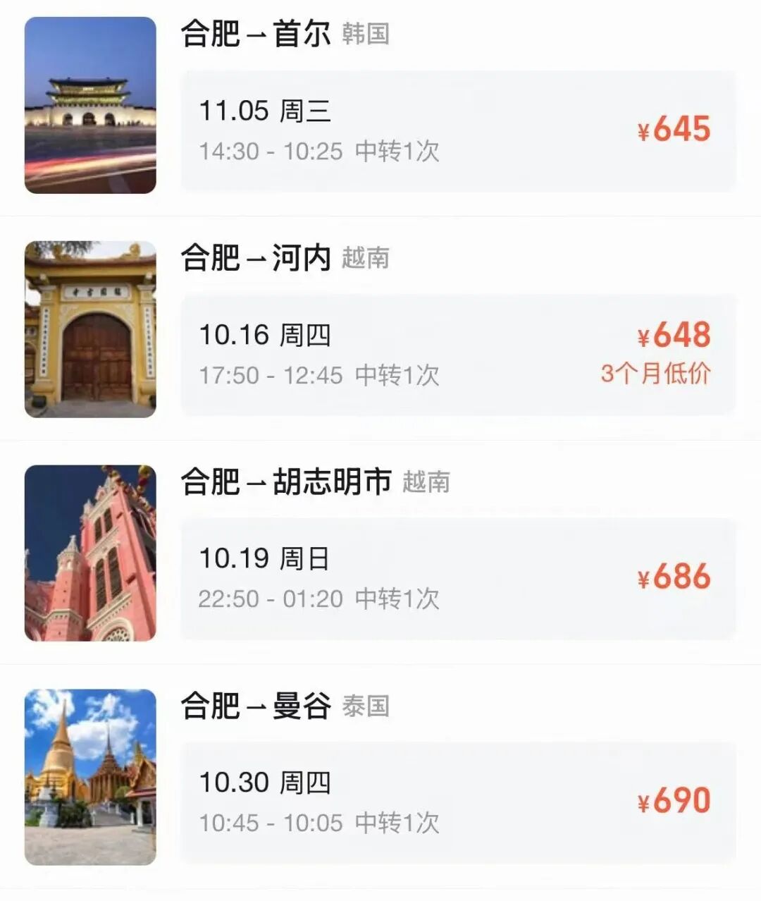 除此之外,国庆假期后的出境机票,也出现了不同程度的降价,合肥去韩国、泰国、越南等地机票也在七八百元。