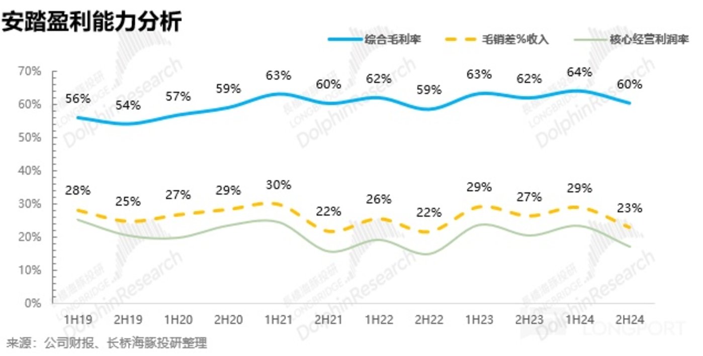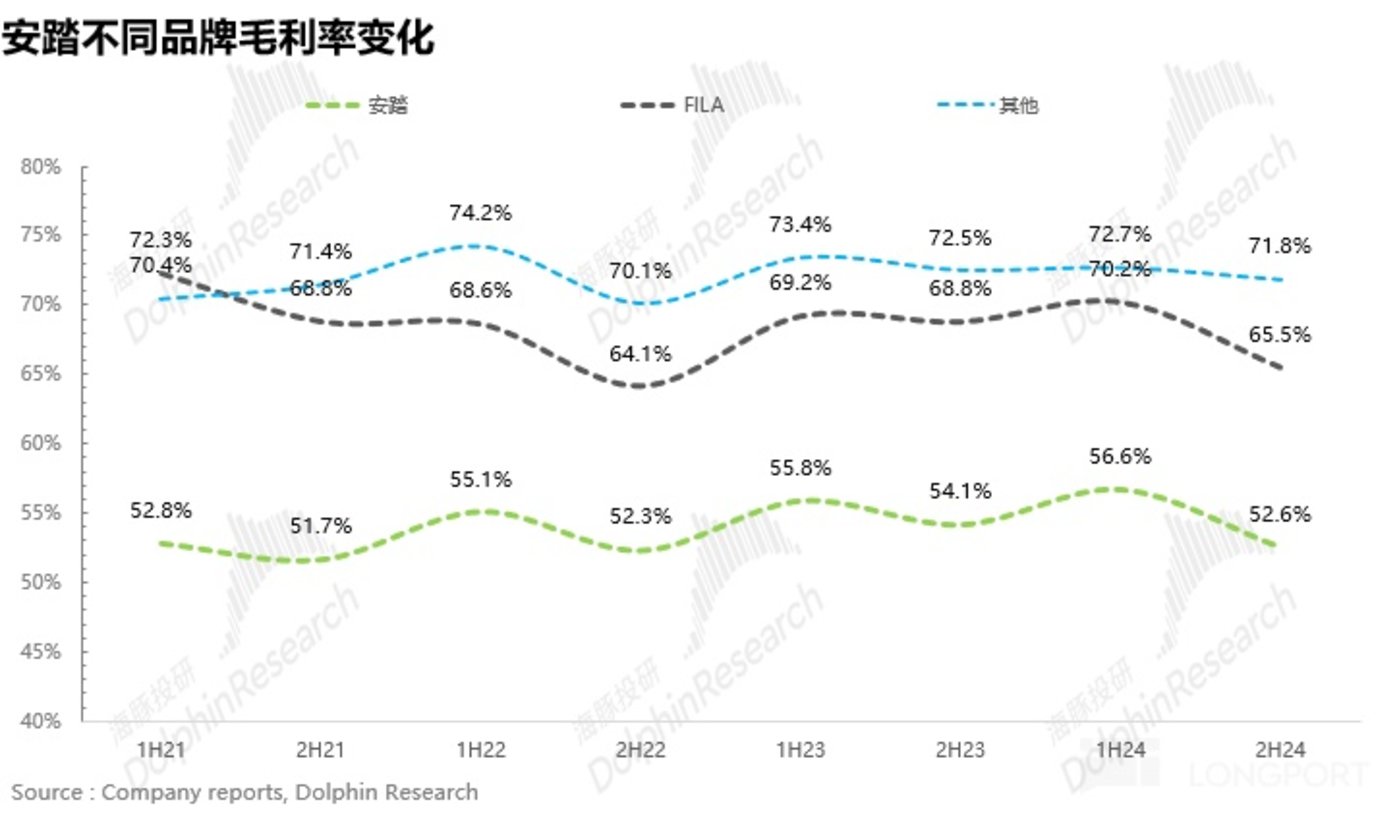 从毛利率上看,根据前文,由于公司 24H2 加大了高性价比产品、店型(超级安踏)的布局,各品牌的毛利率在 24H2 均遭受了不同程度的下滑,其中 FILA 和安踏主品牌毛利率分别同比下降 3.3pct、1.5pct,迪桑特和 Kolon Sport 等高端品牌下滑幅度相对较低,主要系折扣力度小,保持高端品牌调性。