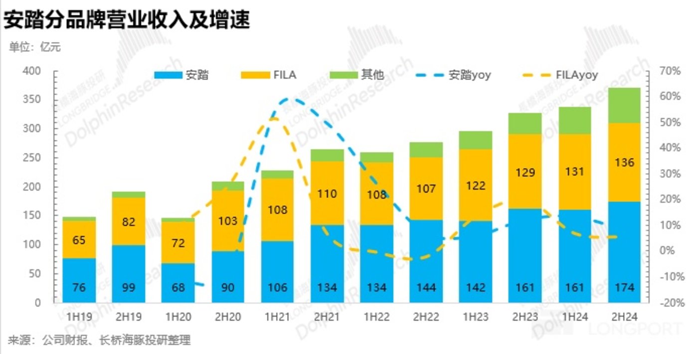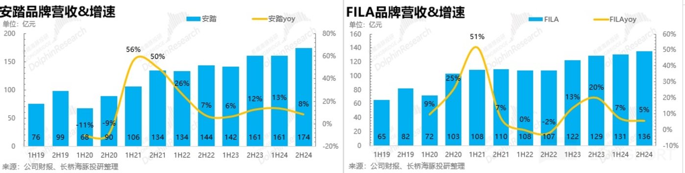 FILA:高增期已过,环比降速。由于儿童市场进入存量竞争,潮流市场受到经济下行压力增长疲软,FILA 整体受到儿童和潮牌 FILA Fusion 的拖累表现偏弱,Q3 流水负增长,Q4 公司通过减少门店数量、优化线下渠道结构、拓宽新品类等调整,FILAQ4 环比 Q3 明显改善,重回正增长,24H2 整体营收同比增长 5.4%,相较于前两年双位数以上的增长明显疲软。