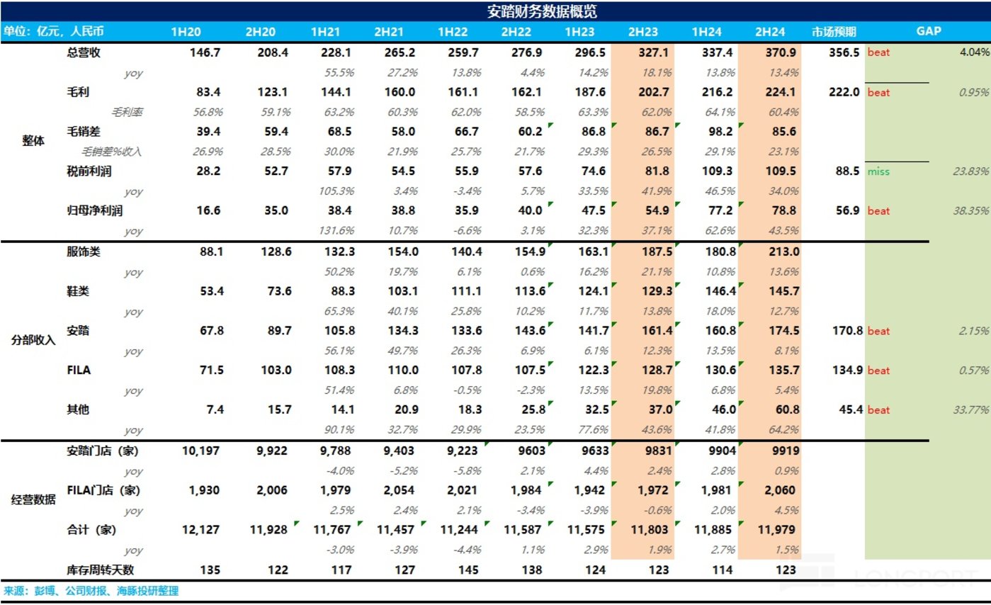 公司 24H2 实现营收 370.9 亿元,同比增长达到 13.4%,与前期公布的零售流水相比营收端小超市场预期(356.5 亿元),核心原因在于公司 “以价换量”,在下半年加大了高性价比产品、高性价比店型——超级安踏的推出。