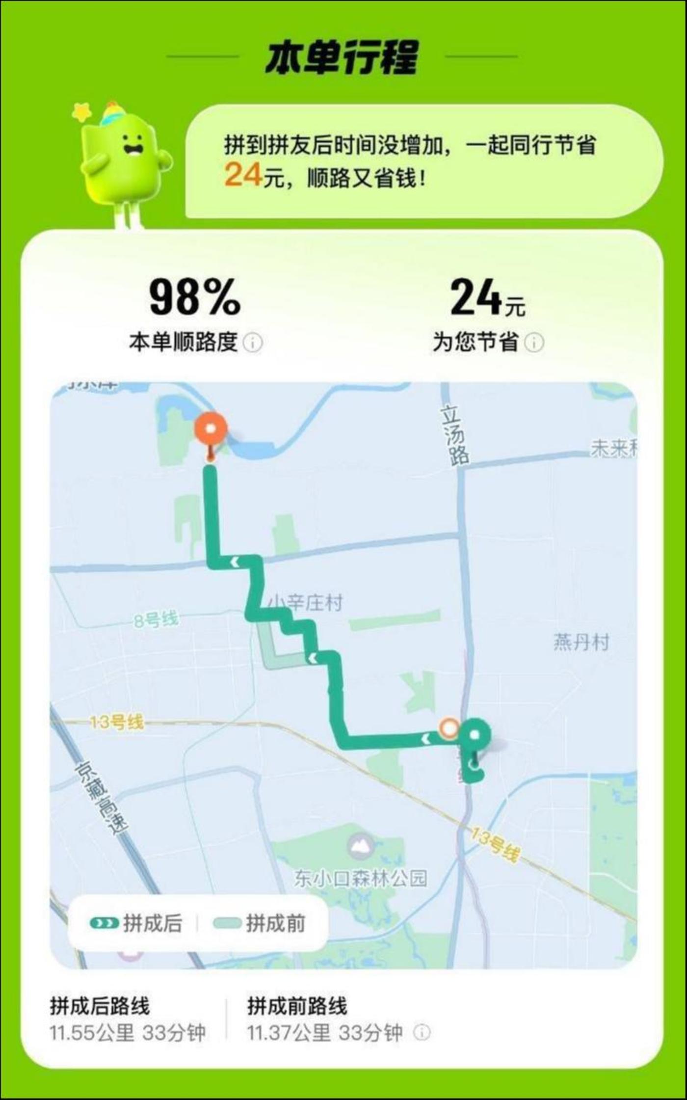 同时,滴滴拼车还升级了“顺路度”展示,让路线可视化、可对比、更直观。在拼成后的行程页,用户点击本单的顺路度,就能看到拼成与未拼成的路线对比,以及预估不同状态下的用时和里程。