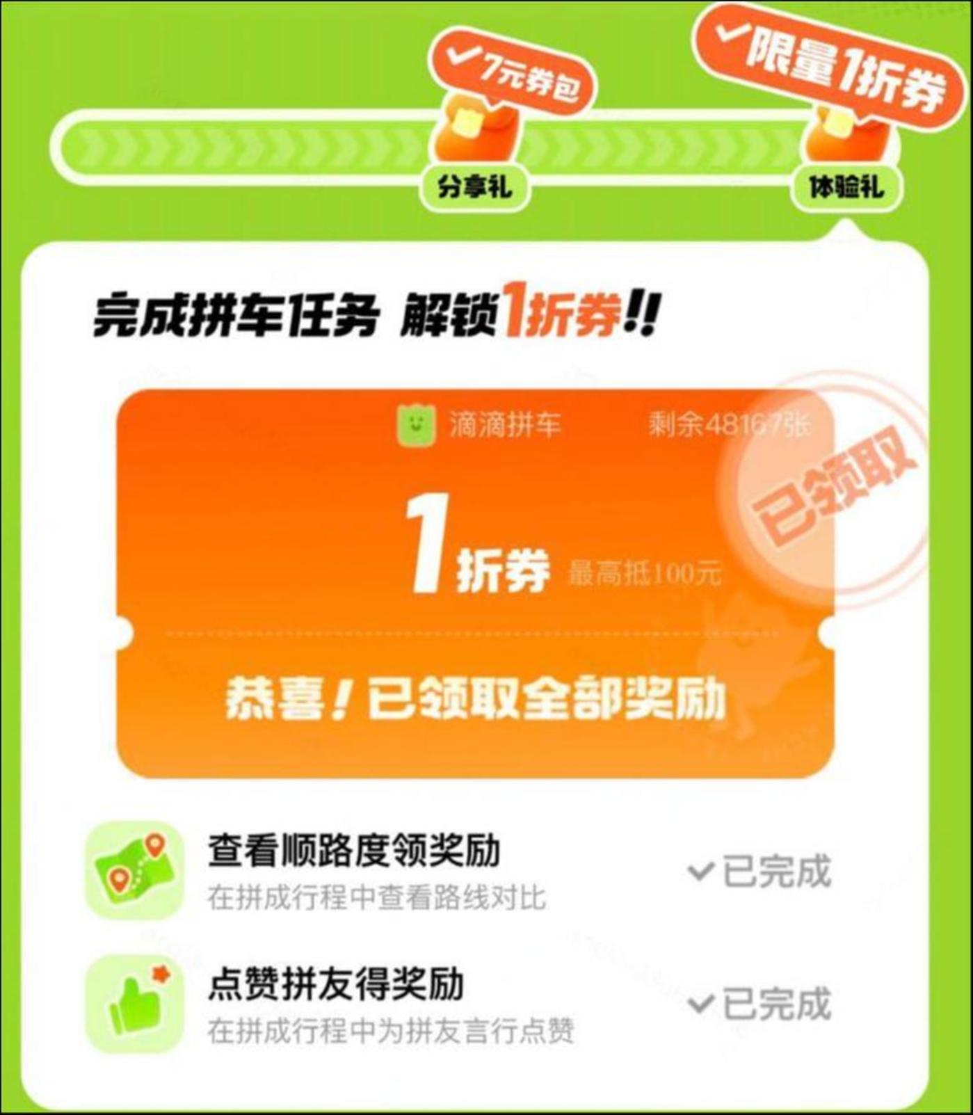 11月25日至12月8日,北京、杭州、成都、南京、西安、长沙、贵阳、合肥等13个城市的用户进入全民拼车日活动主会场,邀请好友助力即可获得拼车立减券。再解锁体验任务,有机会获得拼车1折券。
