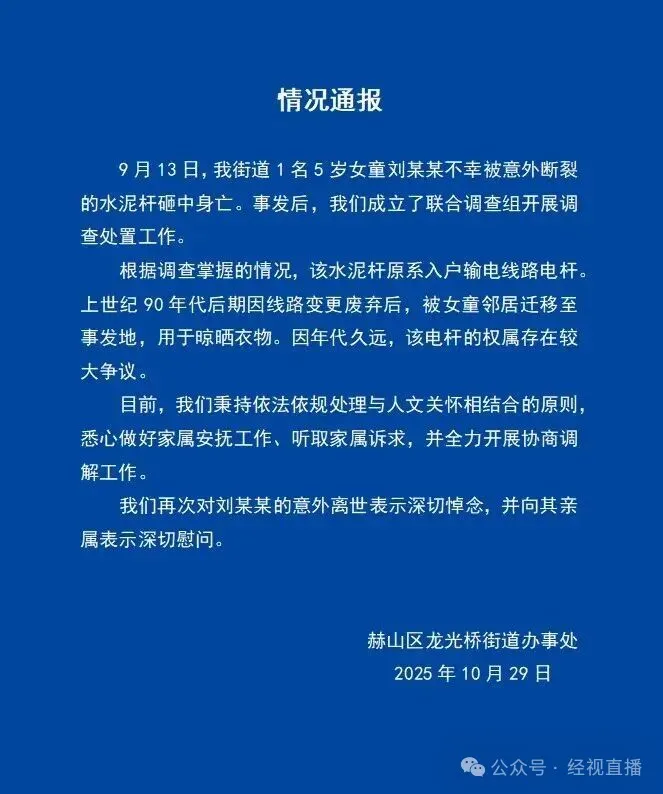 2025年9月13日18时45分左右,刘某某(女,5岁)跟随其外祖父回家途经邻居家前坪时,不幸被一根意外断裂的绑有晾衣绳的水泥杆砸中倒地,于2025年9月13日19时03分送医,经抢救无效,于当晚20时不幸离世。