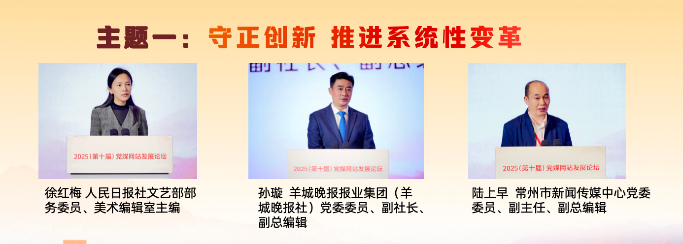 在“守正创新 推进系统性变革”主题研讨环节,人民日报社文艺部部务委员、美术编辑室主编徐红梅,羊城晚报报业集团(羊城晚报社)党委委员、副社长、副总编辑孙璇,常州市新闻传媒中心党委委员、副主任、副总编辑陆上早分别作主旨发言,介绍了各自领域推进系统性变革、发展新时代中国特色社会主义文化的实践与探索。徐红梅表示,“每日读画”采取“AI+美术”“微视频+夜读”的形式,坚持“读准、读细、读新、读美”,让AI成为深入画境、开启古今对话的共创者,以动态转译、意境扩展、流程再造、视听融合开发美术融媒的叙事潜能,深入挖掘中华文明赓续传承的基因密码,成为探索主流媒体系统性变革的微观样本。孙璇表示,羊城晚报全面启动系统性变革,以做强媒体、文化、数据、产业四个战略板块为重点,把“技术赋能”嵌入系统性变革各关键板块,积极增强文化传播、促进文化交流和繁荣文化生产。陆上早表示,常州借“苏超”东风,走出城市转型与能级跃升之路。改革的推进需聚焦六大方向:组织体系化,内容精品化,传播移动化,技术现代化,分配绩效化,干部年轻化。