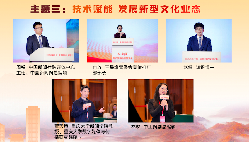在“技术赋能 发展新型文化业态”主题研讨环节,中国新闻社融媒体中心主任、中国新闻网总编辑周锐,三星堆管委会宣传推广部部长冉放,知识博主赵健,分别就技术赋能中华文化“破圈”出海、三星堆文化传播数智实践、短视频文化传播等方面的经验成果进行了精彩展示。重庆大学新闻学院教授、重庆大学数字媒体与传播研究院院长董天策,中工网副总编辑林琳作为互动嘉宾进行了点评,期待主流媒体发挥传播实践智慧,在内容、技术和社会责任之间找到平衡,铸造中华文化新辉煌。