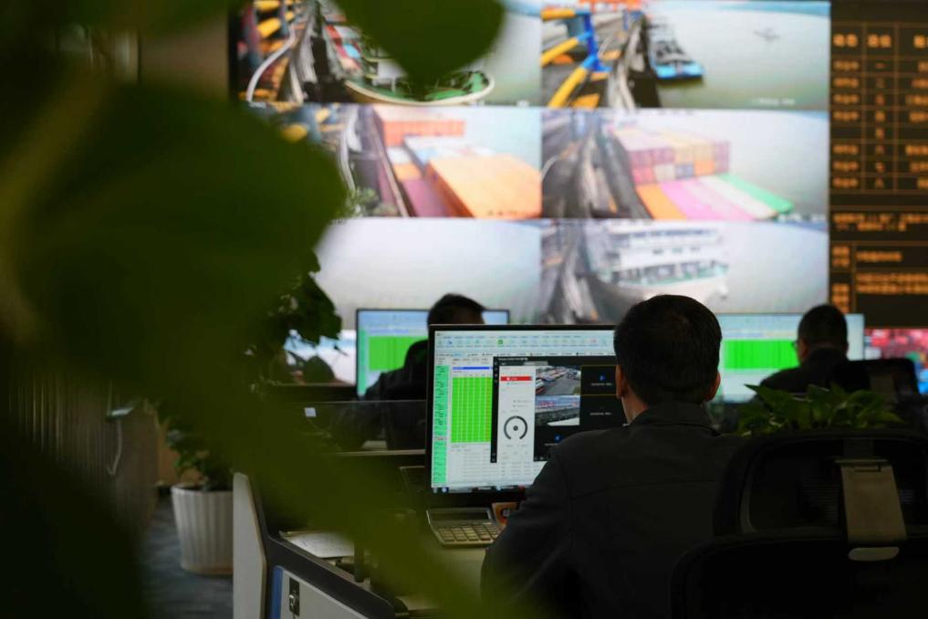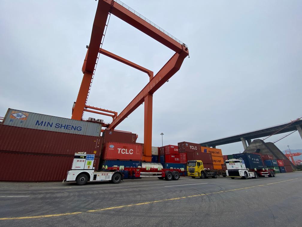 货轮上五颜六色的集装箱被岸桥稳稳“夹”起,堆场上摆满货物,秋冬时节的果园港依旧热火朝天。指着远程控制室巨大屏幕上的两台白色无人驾驶集装箱卡车,刘炼说:“港口建设迈向智能化、绿色化,为果园港提升多式联运物流效率、承担更多开放功能,提供了坚实支撑。”