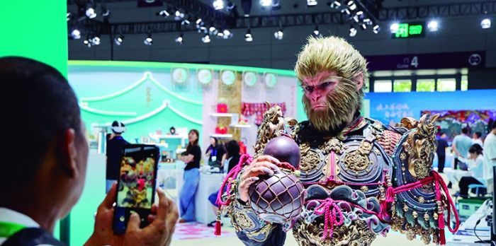 观众在文博会上拍摄黑神话悟空半身像。 新华社图