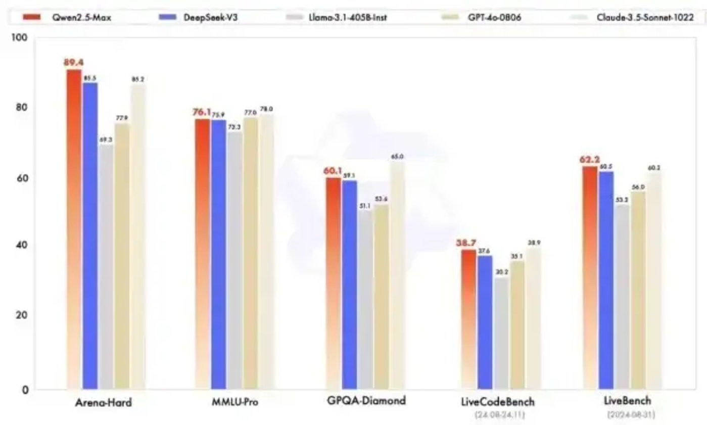 在测试大学水平知识的MMLU-Pro、评估编程能力的LiveCodeBench、全面评估综合能力的LiveBench,以及近似人类偏好的Arena-Hard等主流测评中,Qwen2.5-Max都取得了相对领先的成绩。