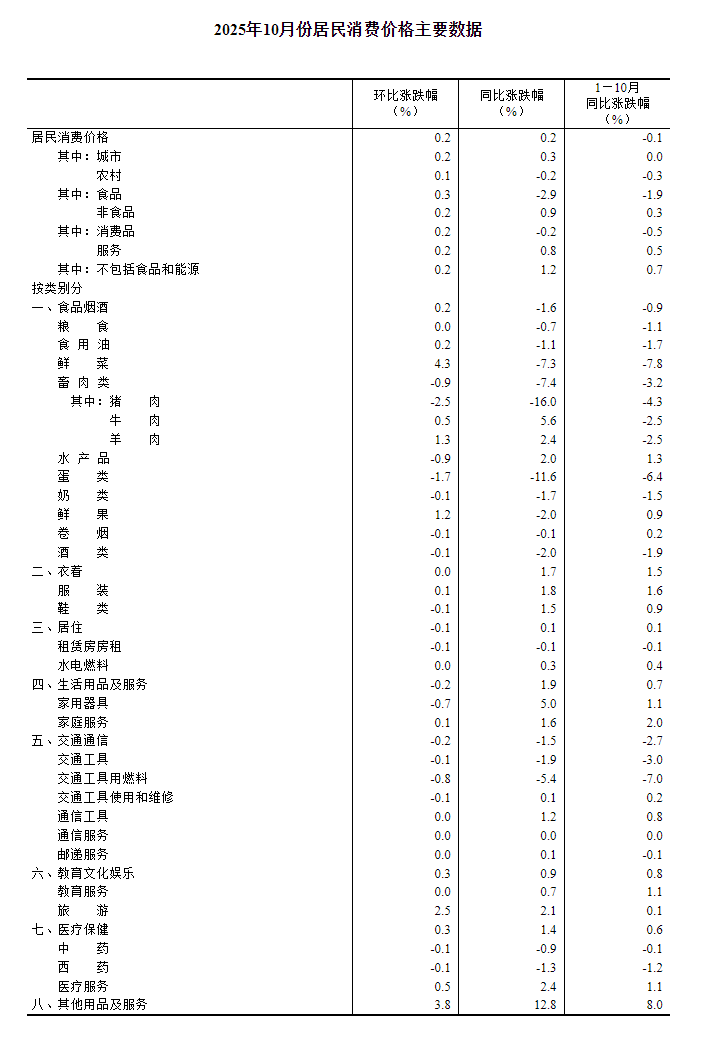 2025年10月份,全国居民消费价格同比上涨0.2%。其中,城市上涨0.3%,农村下降0.2%;食品价格下降2.9%,非食品价格上涨0.9%;消费品价格下降0.2%,服务价格上涨0.8%。1—10月平均,全国居民消费价格比上年同期下降0.1%。