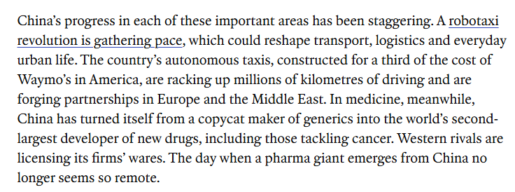 文章分析指出,中国在这两个重要领域的进展令人瞩目。自动驾驶出租车革命正在加速发展,这可能会重塑交通运输、物流和城市的日常生活。中国的自动驾驶出租车造价仅为美国的三分之一,行驶里程已达数百万公里,并在欧洲和中东地区建立了合作关系。与此同时,在医药领域,中国已从仿制药生产国转变为全球第二大新药研发国。
