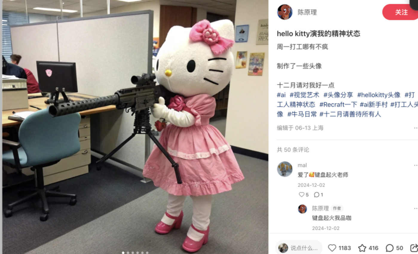 回忆上一轮借助IP+技术爆火出圈的,还是席卷微信的AI版Hello Kitty头像,清一色的Hello Kitty身穿各种奇装异服,出现在各种诡异场景,打拳击、摇呼啦圈、身穿比基尼度假、手拿步枪对准富士山等……最经典的一张,是Kitty猫身穿和服回望镜头面无表情,背后是熊熊燃烧的金阁寺。
