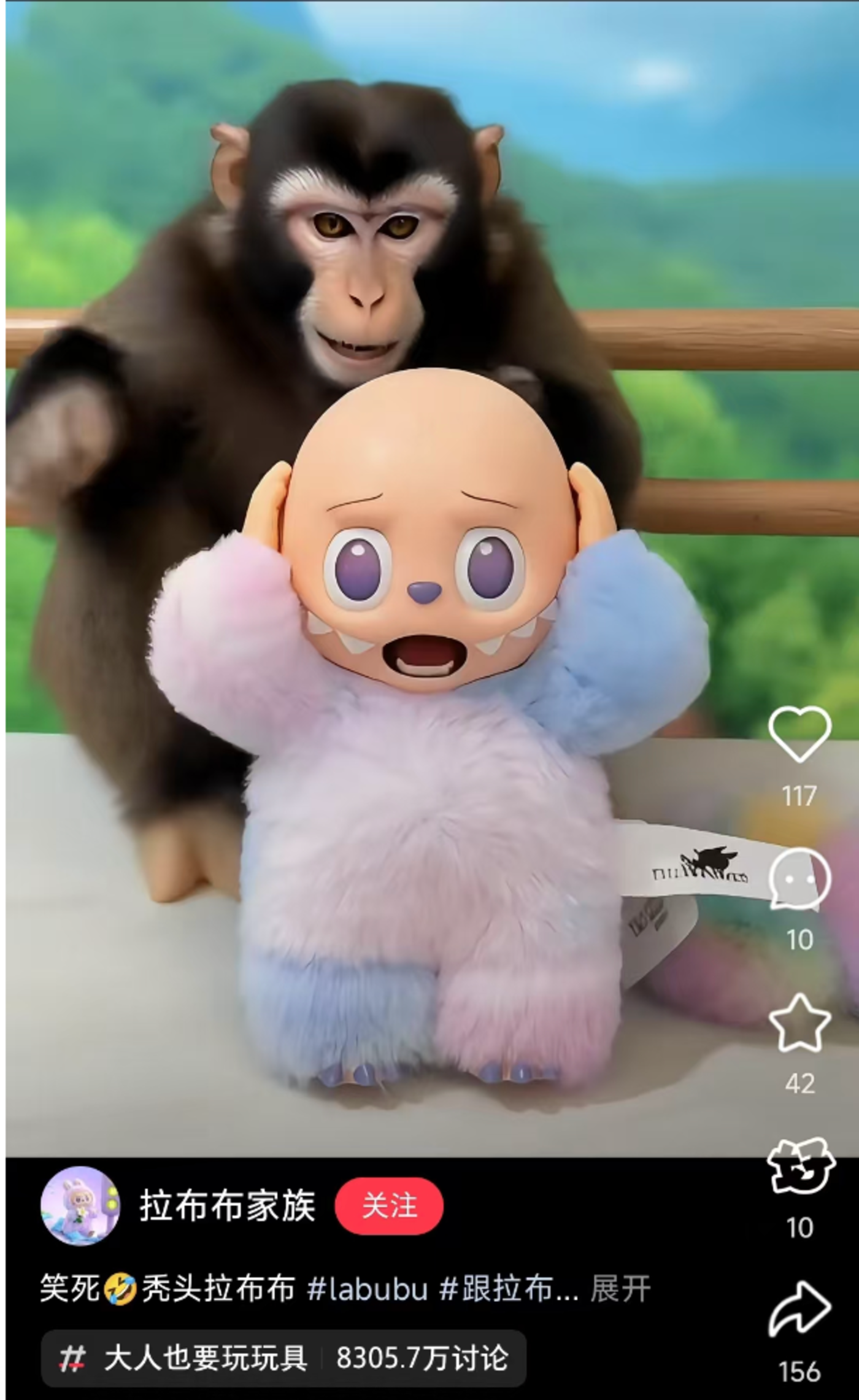 如,由AI生成的“LABUBU眨眼龇牙”“偷偷摸摸溜墙角”等小动作,将其“凶萌”特质具象化,比静态玩偶更具感染力。