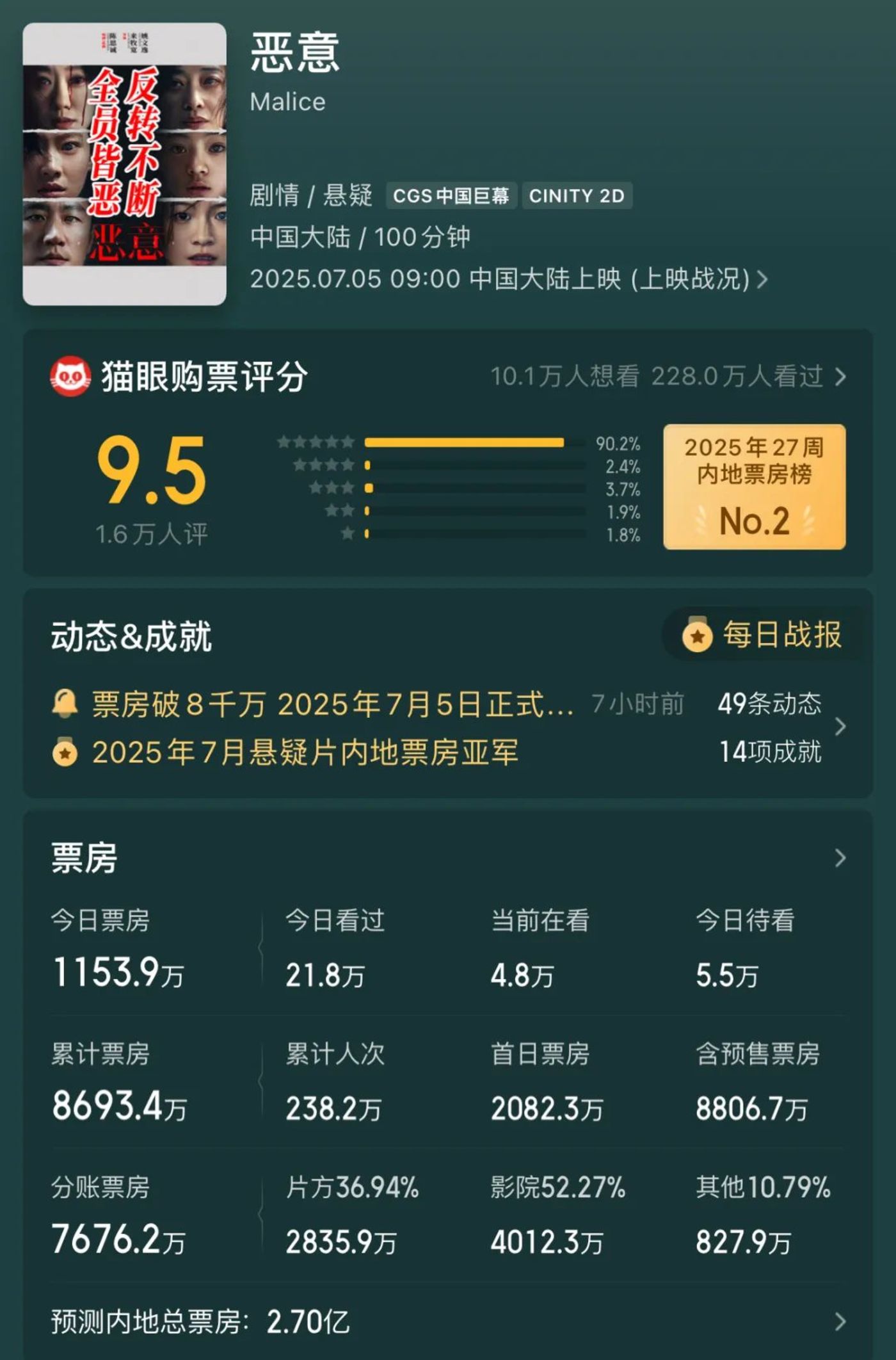 如今,猫眼对《恶意》的总票房预测为2.7亿元,这与影片映前外界普遍预测的4亿到5亿总票房,差值还是较大的。