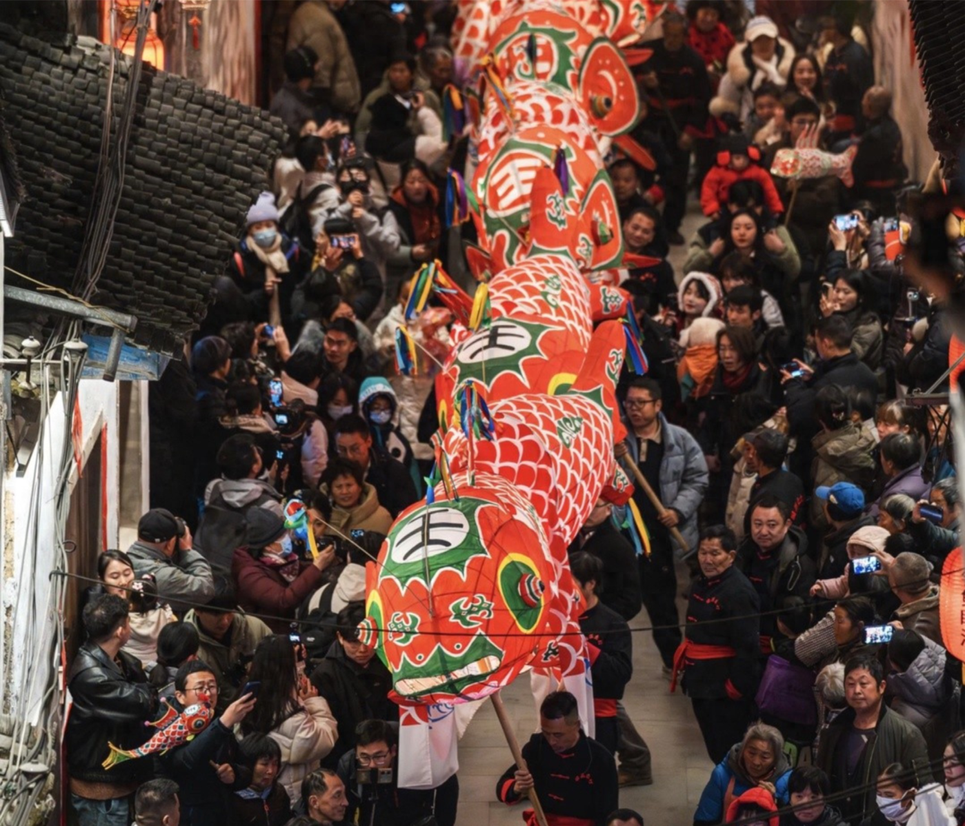 数据显示,今年春节期间,瞻淇古村接待游客7.3万人次、增长457%,歙县春节七天仅鱼灯销售近万只,销售额超百万元。一夜之间,各种鱼灯体验馆、面馆如雨后春笋般开业,而用鱼灯元素制作的发钗、胸针、冰箱贴、香囊等文创产品,也为当地文旅产业带来了多元增长。
