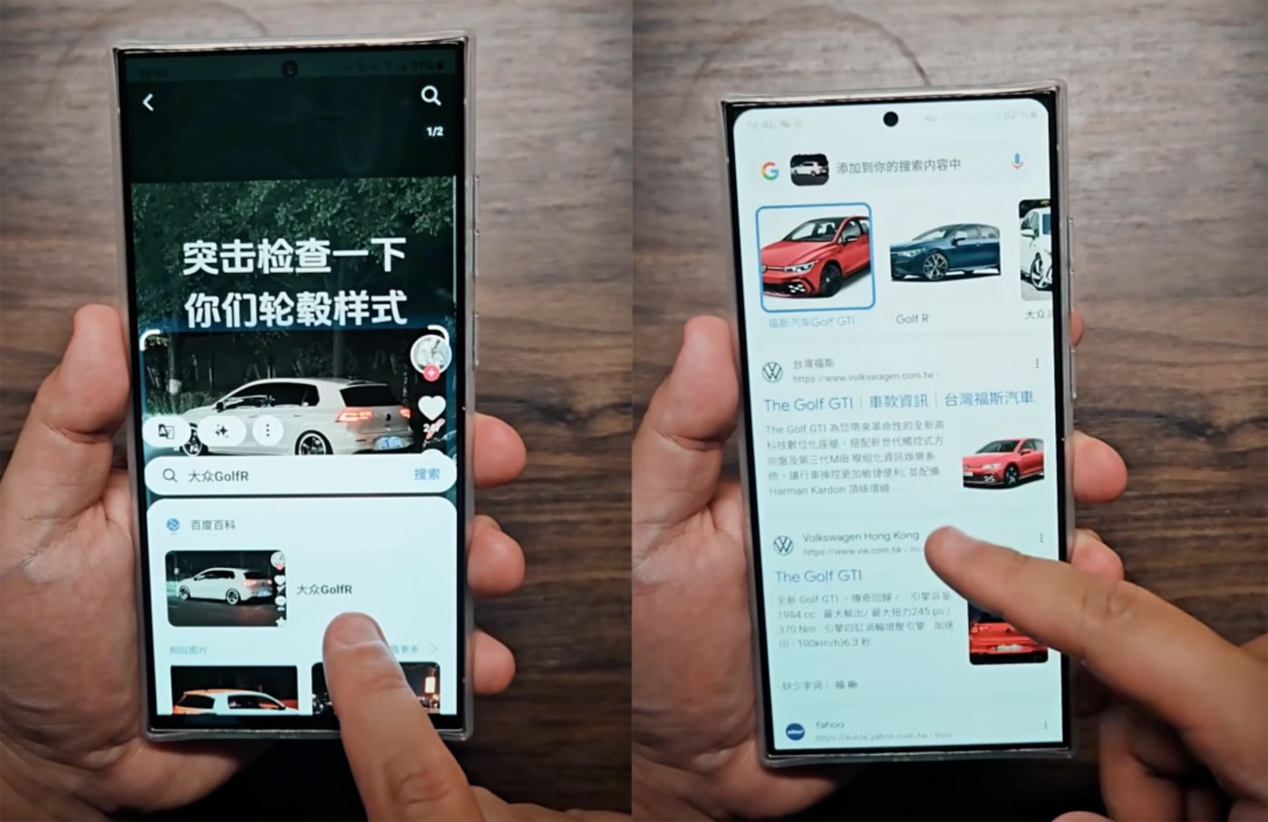 博主@你好帅杨 就测试过同一款机器上基于谷歌的即圈即搜和基于百度的区别。结果显示谷歌能准确识别这台汽车是高尔夫 GTi,而百度直接把型号都识别错了,说是高尔夫 R。