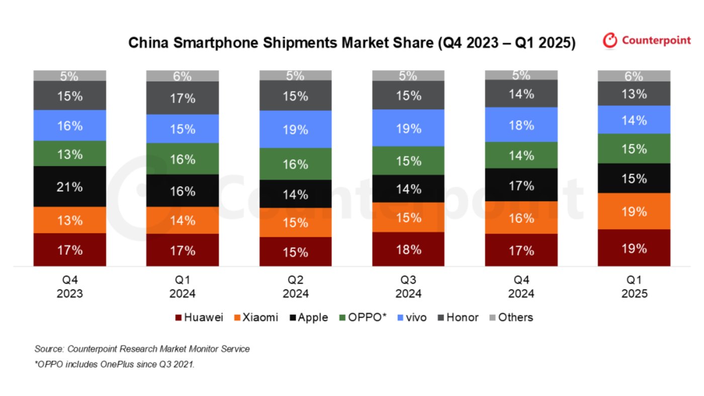 另一方面,残酷的数字反映了苹果在中国市场是真不乐观。2024 Q4 苹果的市场份额只有 17%,到了 2025 Q1 更是跌落至 15%,但同期智能手机市场整体增长约 3.3%。