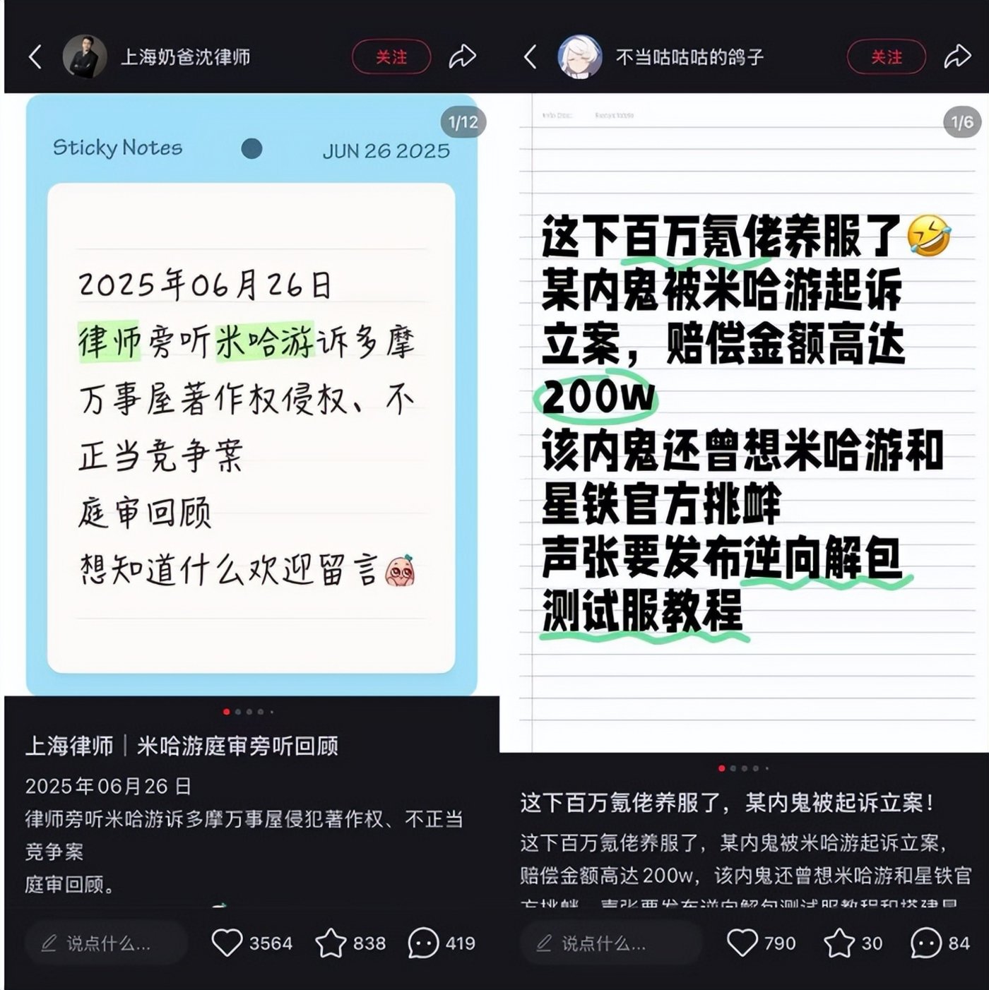 除了内容本身的“新”,在场外的二游厂商也有了不少新动作。叠纸联手X11以“暖暖”为创作灵感推出了DearNikki系列盲盒,首发卖出了400多万销量;米哈游则加紧了“律师函”出击的速度,不仅将泄露未来版本数据的解包佬告上法庭,还顺手把靠同人创作盈利的多摩万事屋告了——诉其不正当竞争、侵犯著作权,据说庭审当天旁听席坐得满满当当,超50人到场旁听,庭外还有不少玩家站脚助威。