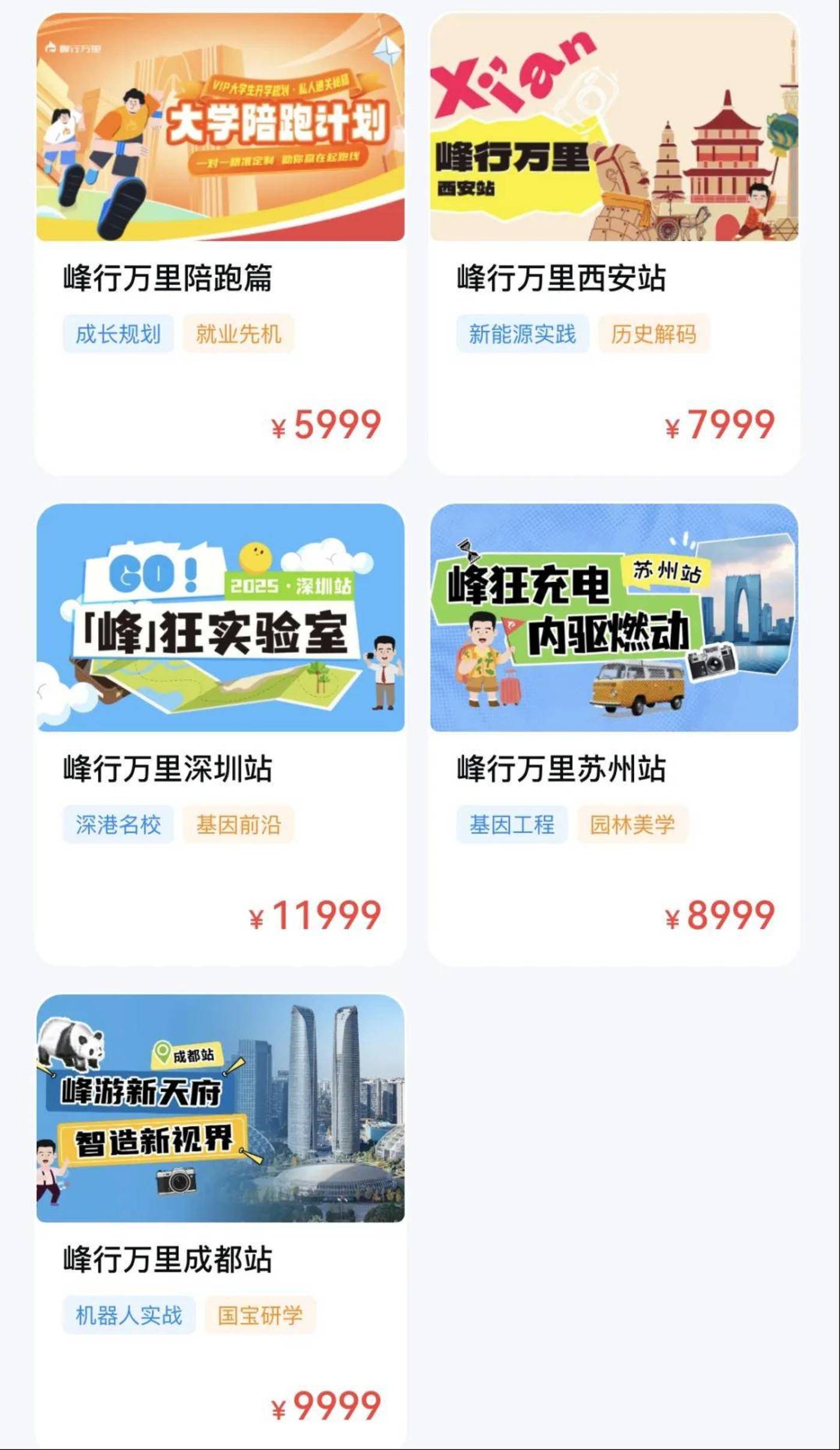 从高价研学项目到平价咨询服务,峰学蔚来将不同需求、不同消费能力的客户群体尽数纳入其中。
