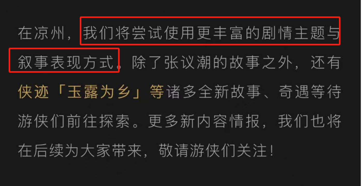 《燕云》官方显然知道自己的长板所在,并持续发挥在剧情方面的优势,所以开服后逐步开放的河西版本,成了官方针对“玩家对剧情能够接受到什么地步”的试验田。小娱看过他们对外资料,里面称“要把剧情党逐步提高到70%”“凉州剧情采用了舞台剧设计”,策划沉浸在自己的艺术世界里不能自拔,只是苦了过主线的玩家。