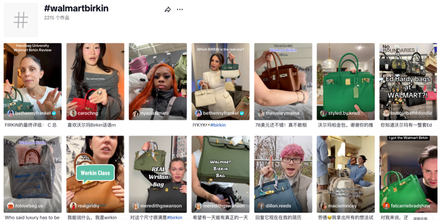 TikTok用户Kristi Stephens发布的“Wirkin”开箱视频获得近900万次观看,随后大量用户以#WalmartBirkin、#BirkinDupe 等标签下的视频引发了大量讨论和模仿,内容从惊叹其“物超所值”、“看起来很贵”,到分享在不同门店“寻宝”Wirkin的经历,甚至引发了线上线下的抢购潮。