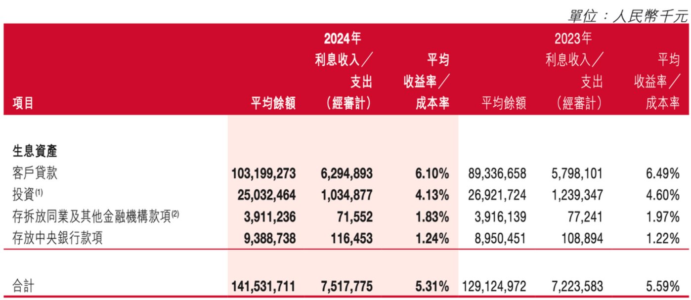 而从资产端来看,2024年,泸州银行生息资产平均收益率达到5.31%,虽然较上年下降0.28个百分点,但仍在行业中排名前列。其中,客户贷款1031.99亿元,平均收益率为6.10%;投资250.32亿元,平均收益率为4.13%。